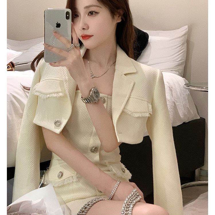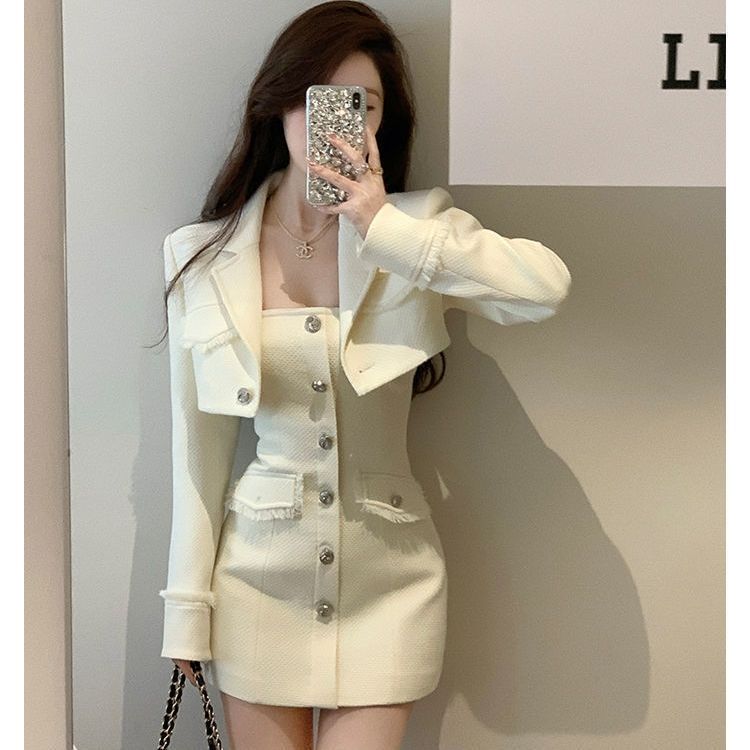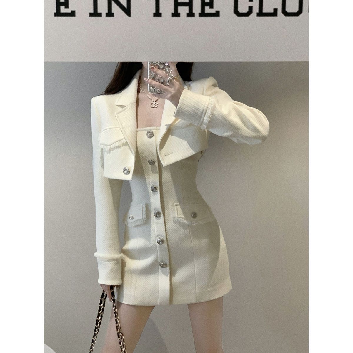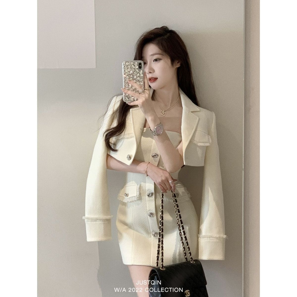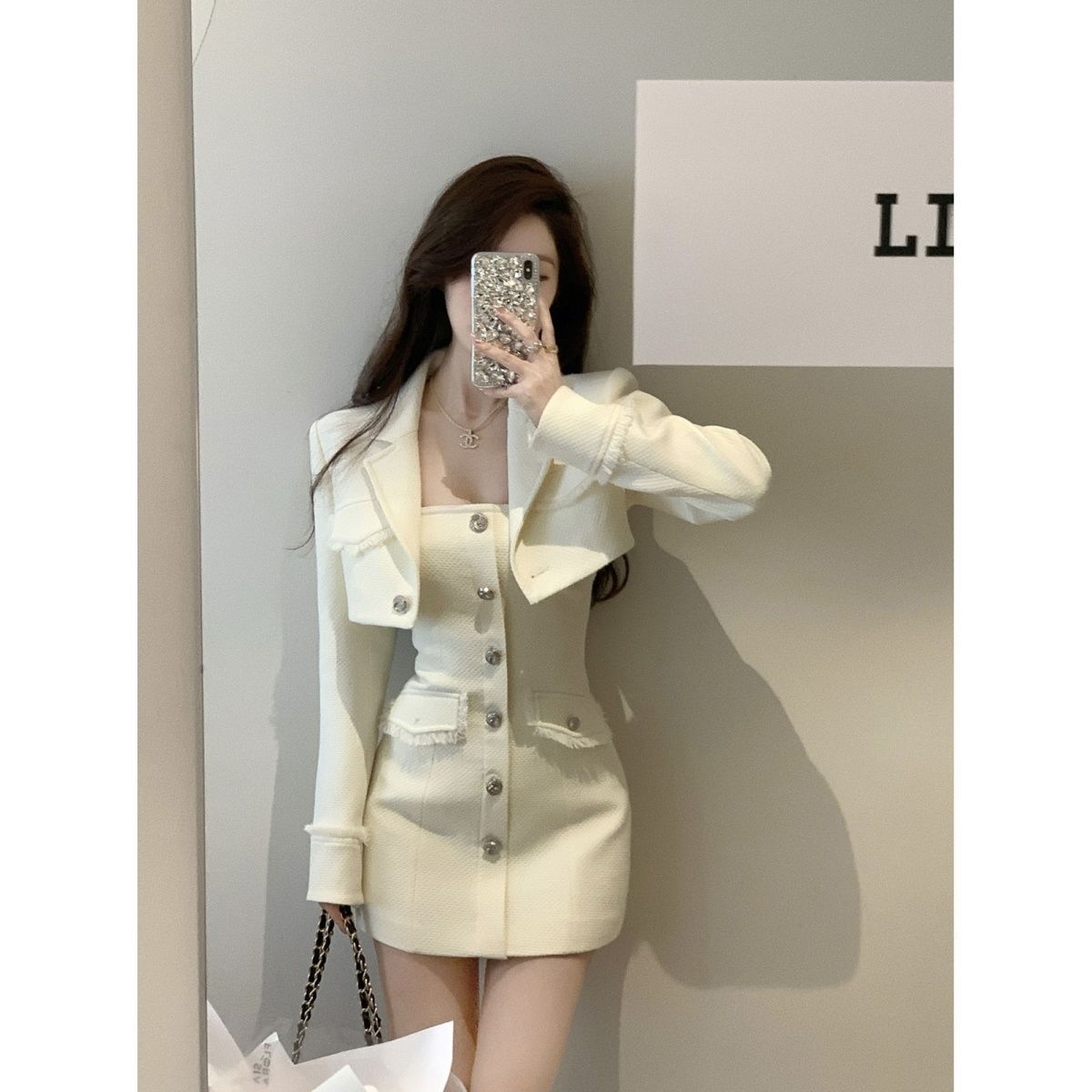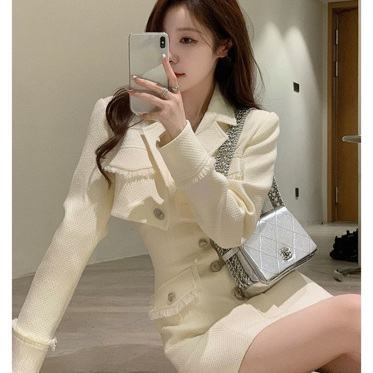 富家千金小香風スーツ女性秋冬感気質名媛ショートコート蓬蓬ワンピース2点セット