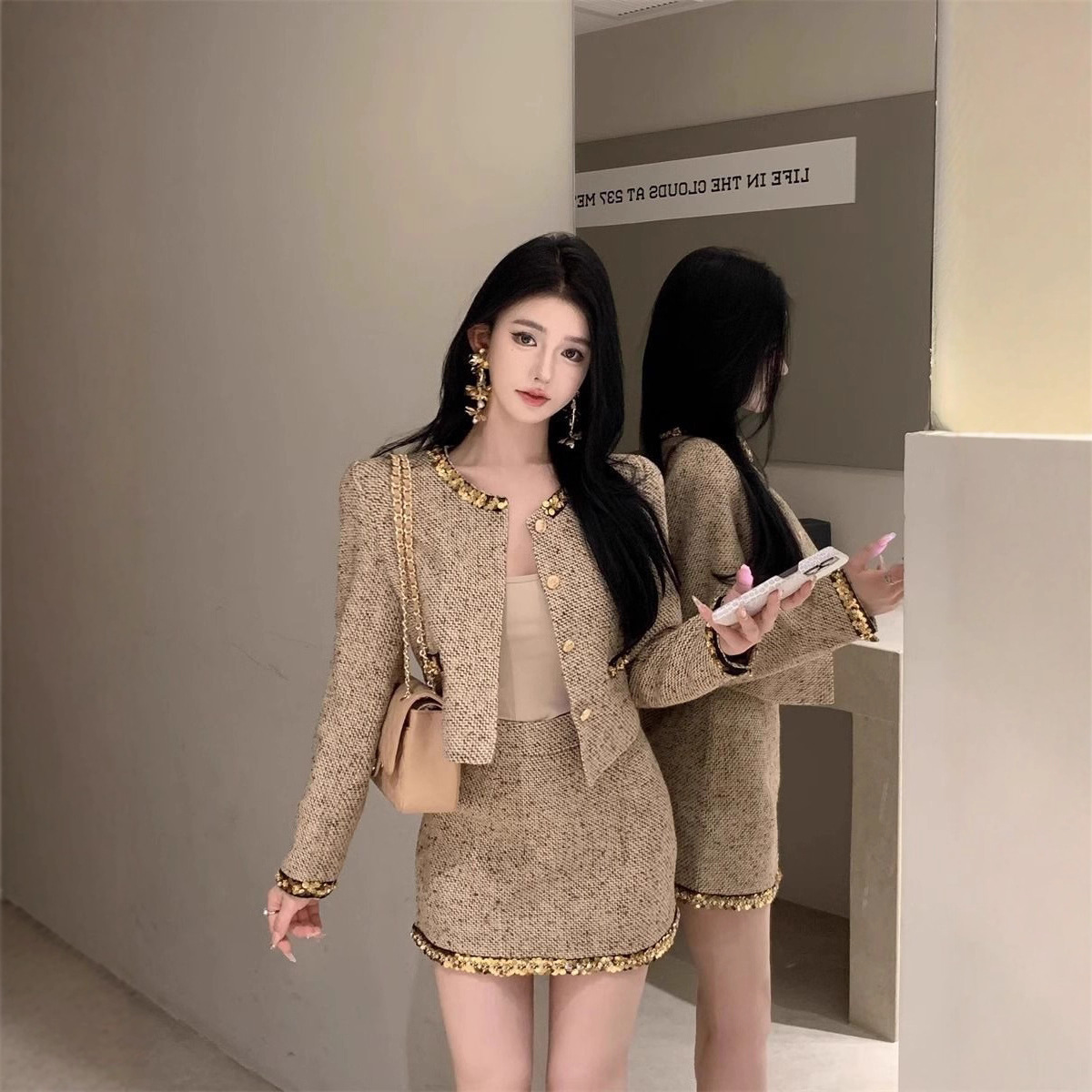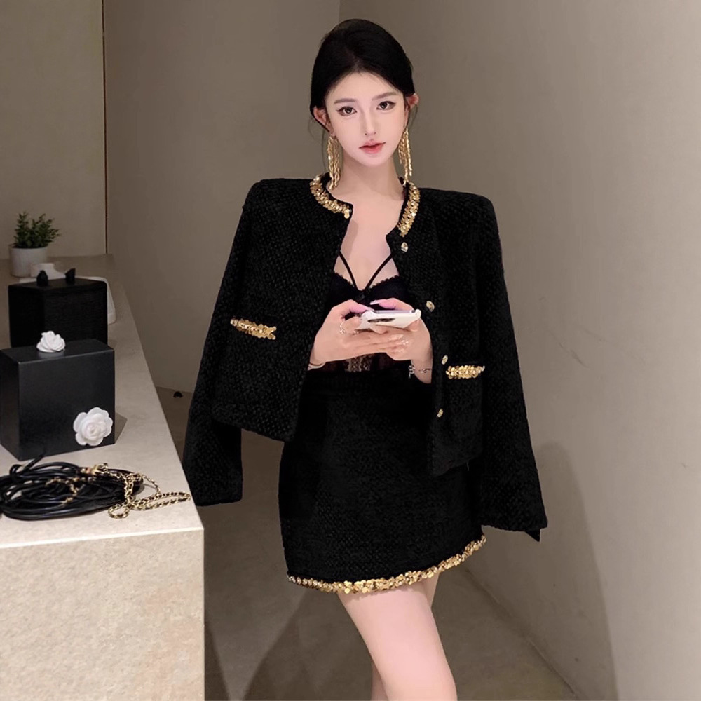 秋季高级感韩系套装裙小香风亮片外套+包臀半身裙富家千金两件套