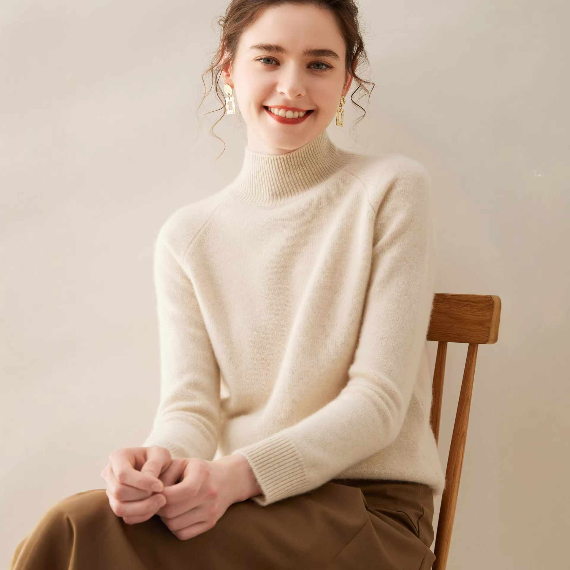 冬季新款半高领山羊绒衫女加厚亲肤纯色羊毛插肩袖宽松毛衣打底衫