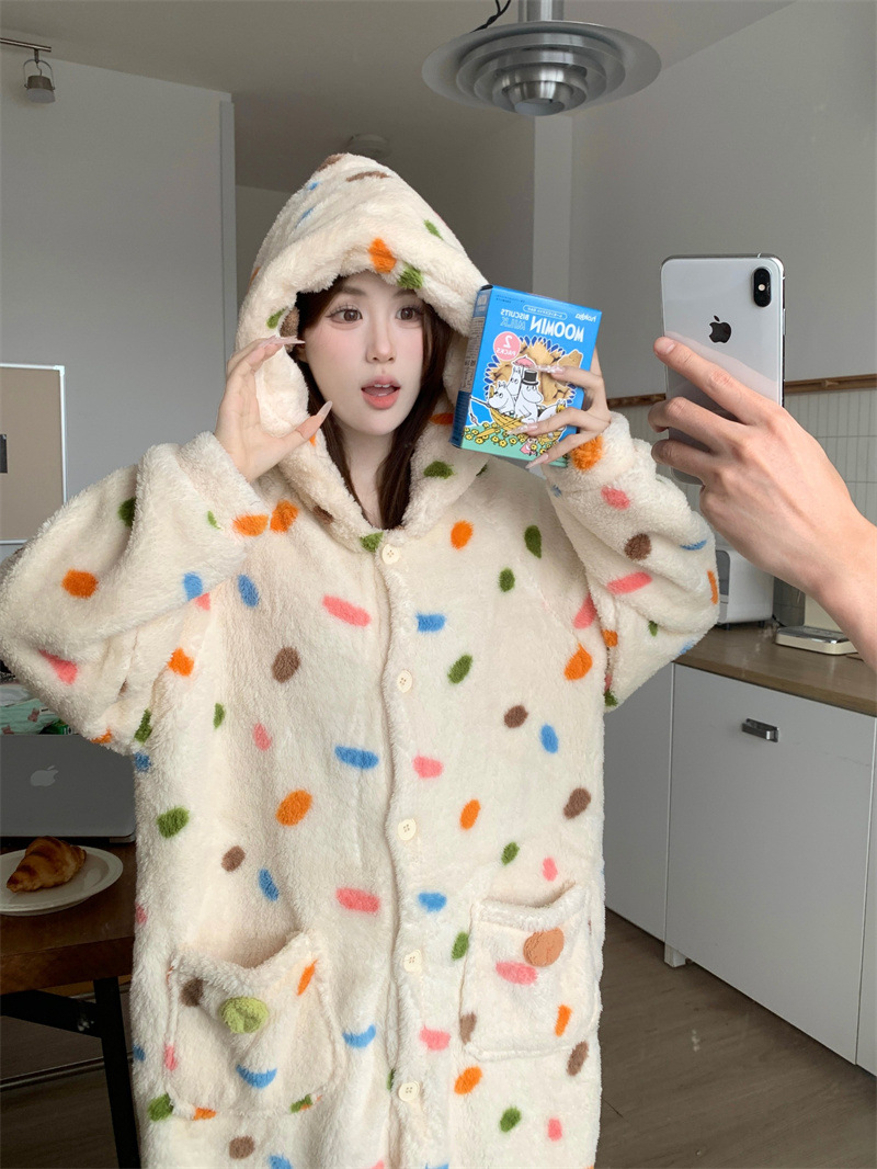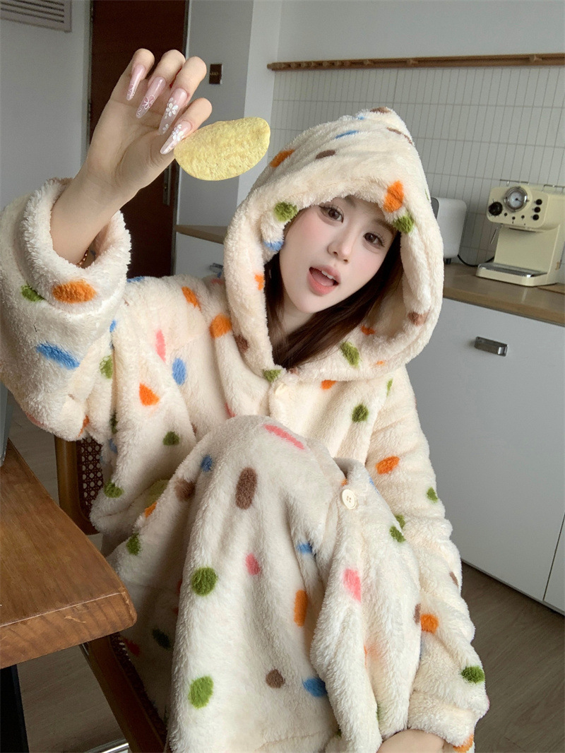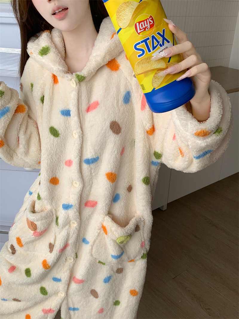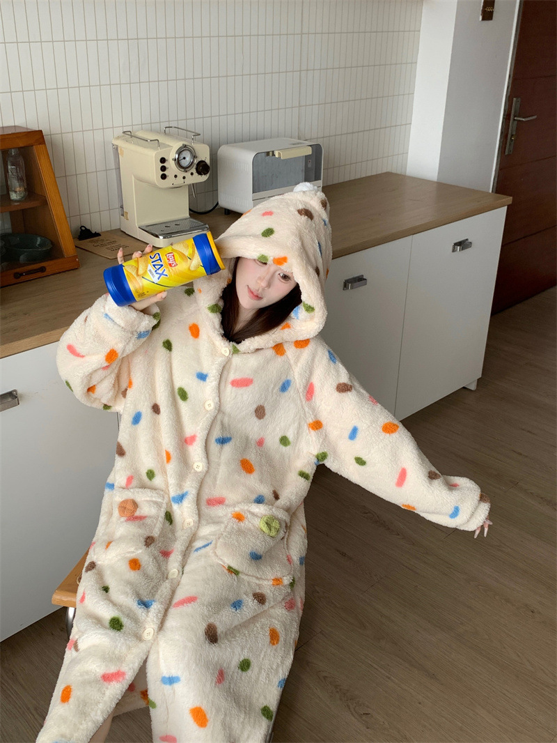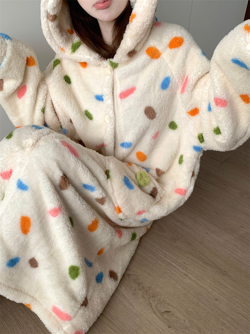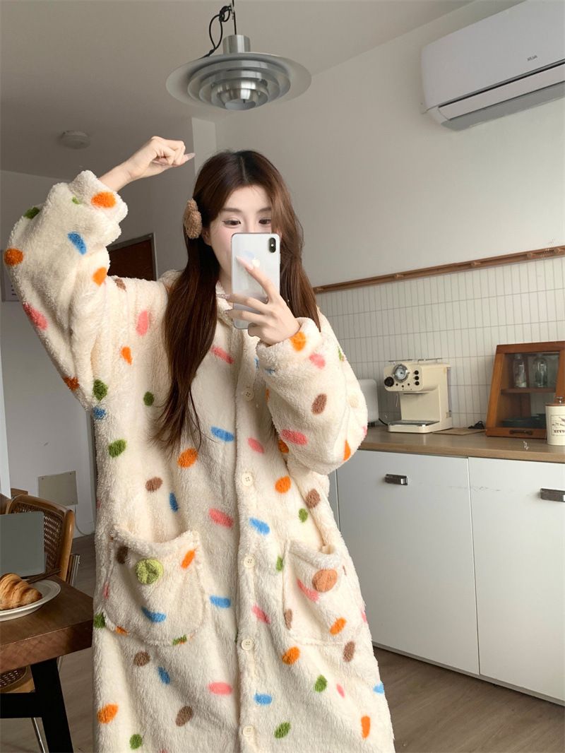 2024年の新型カラー韓国版の甘くて可愛い色の波点の寝衣の長いネットの赤い冬のパジャマの女性の絨毯の家の服