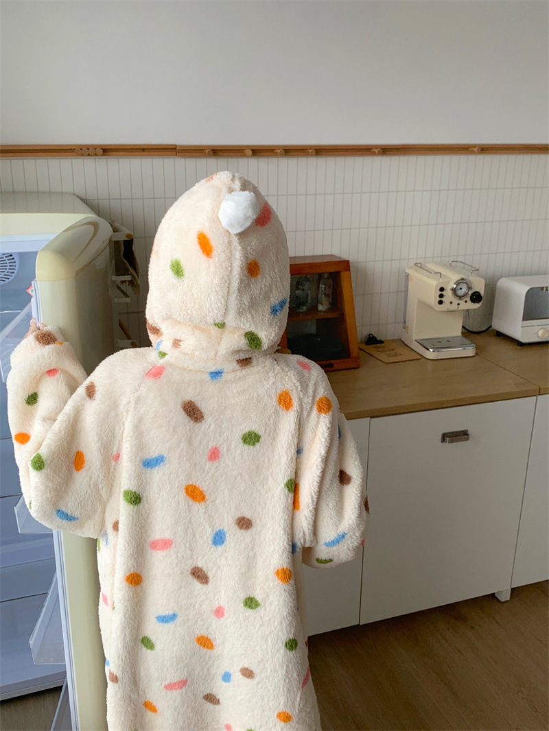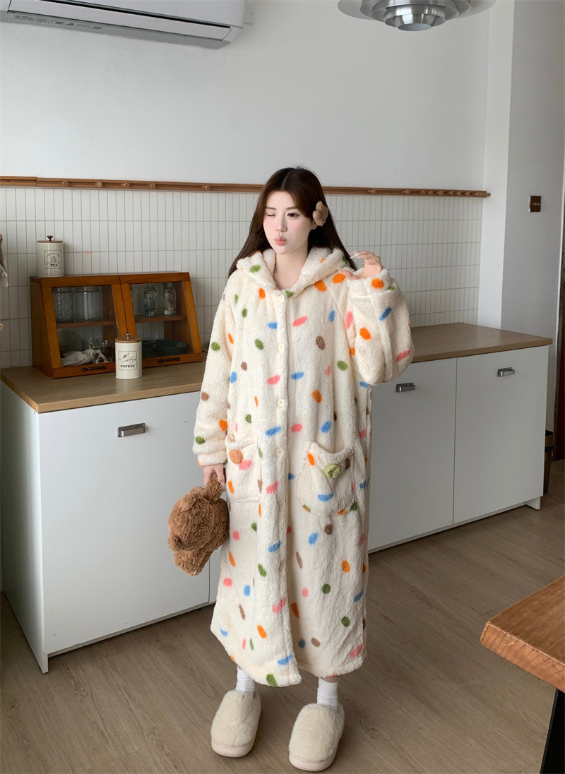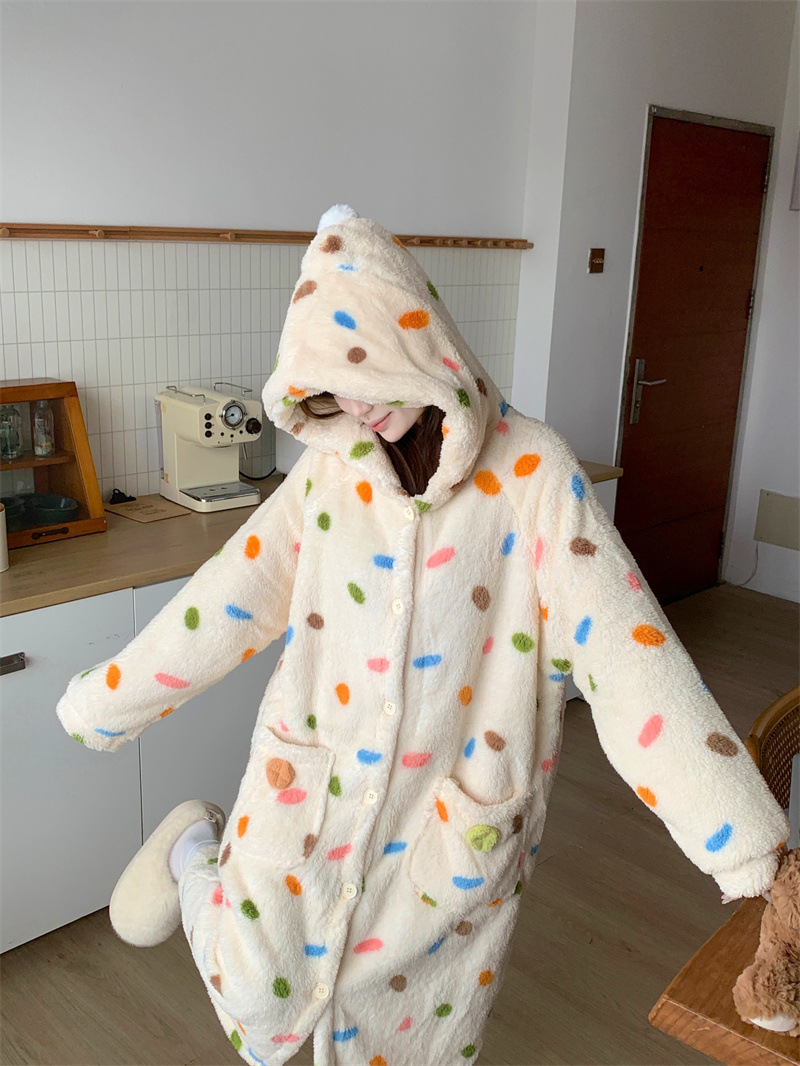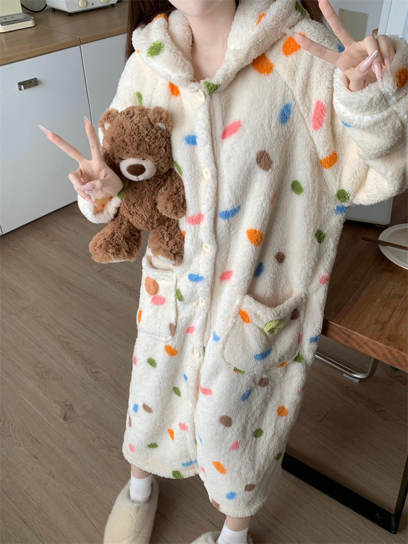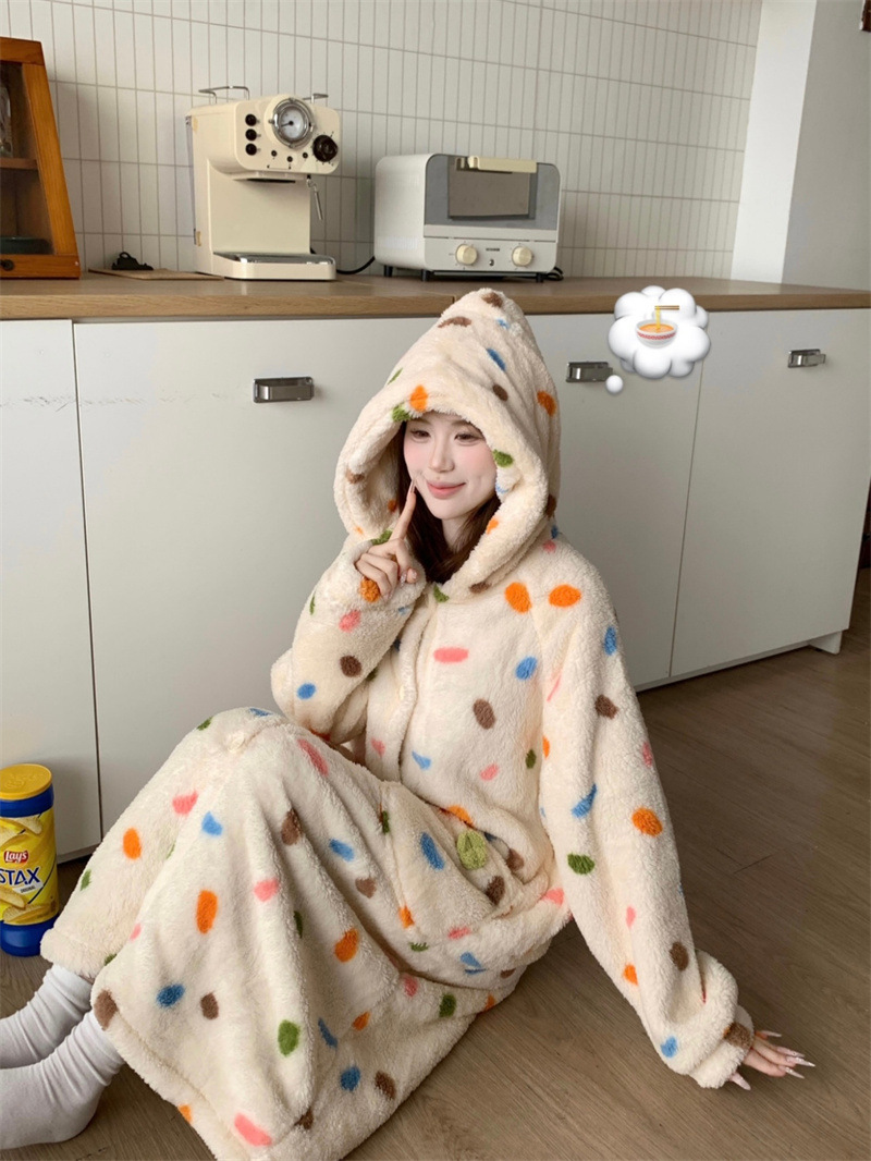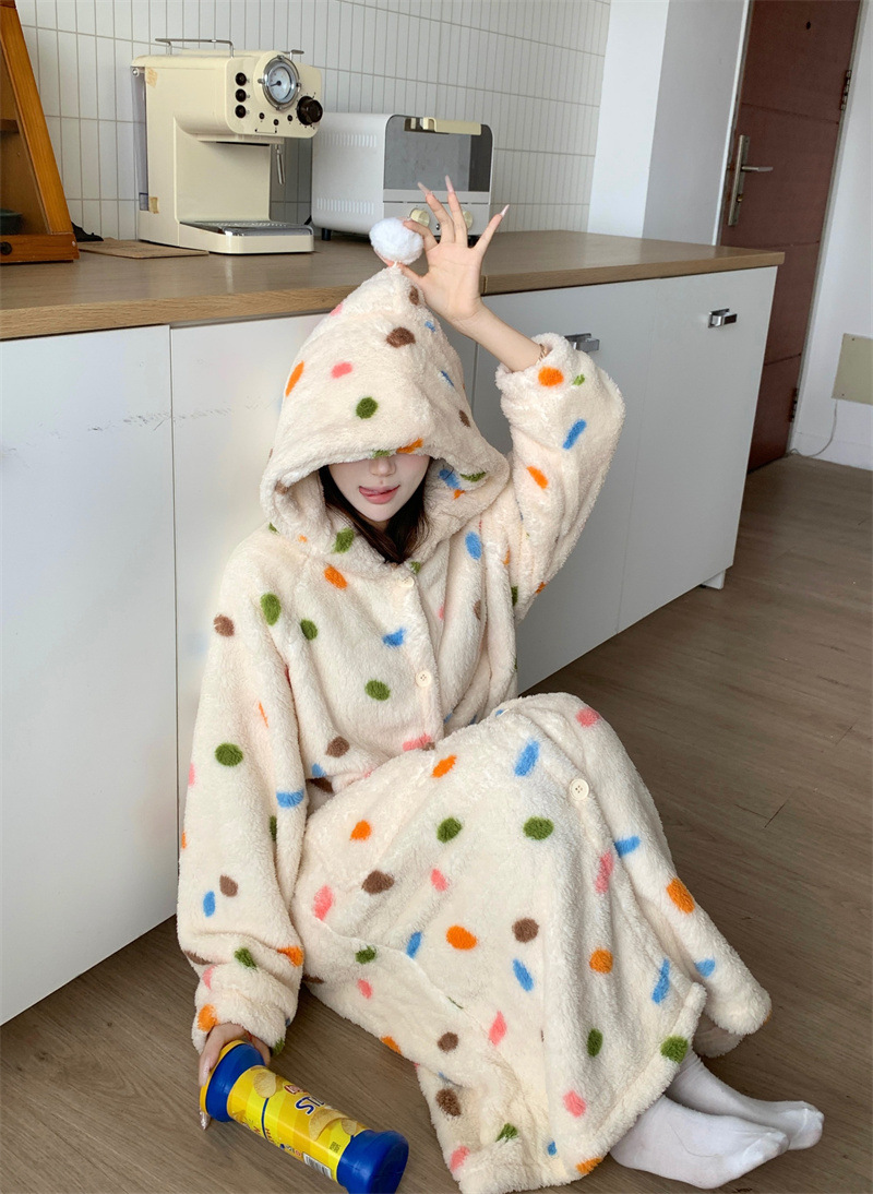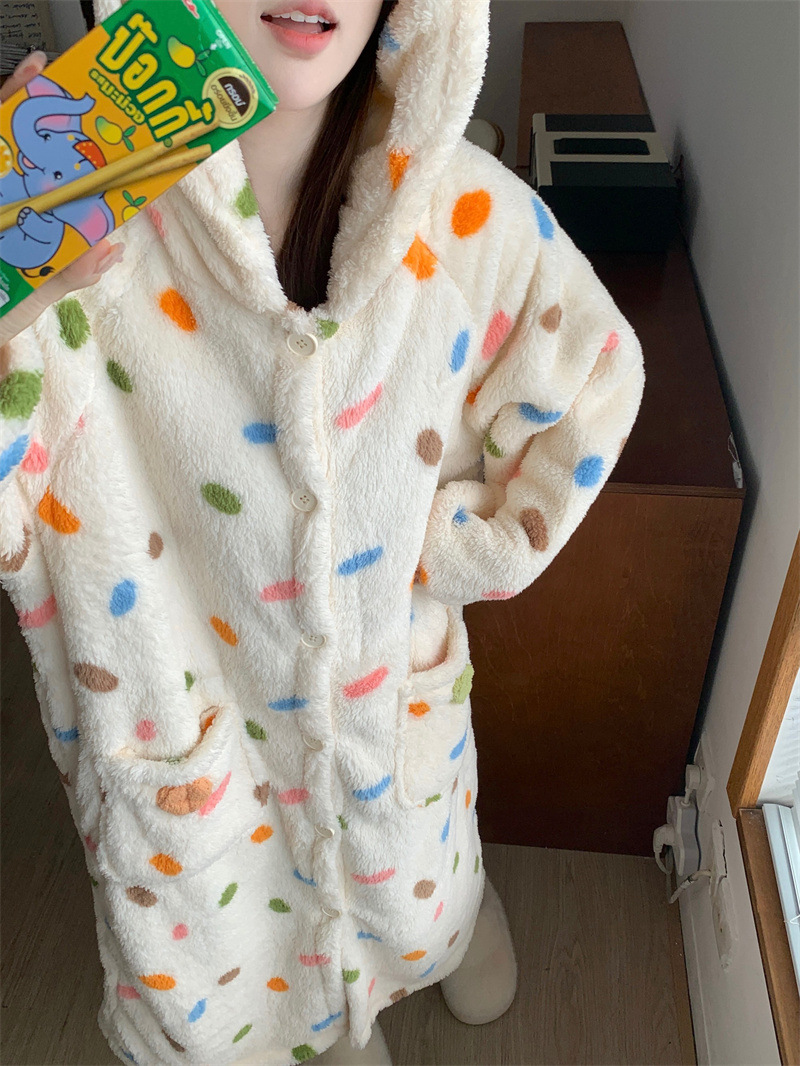 2024年の新型カラー韓国版の甘くて可愛い色の波点の寝衣の長いネットの赤い冬のパジャマの女性の絨毯の家の服