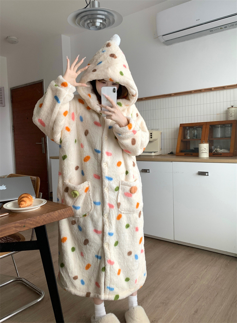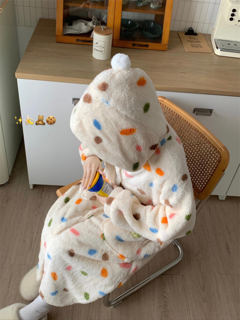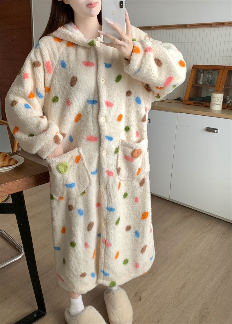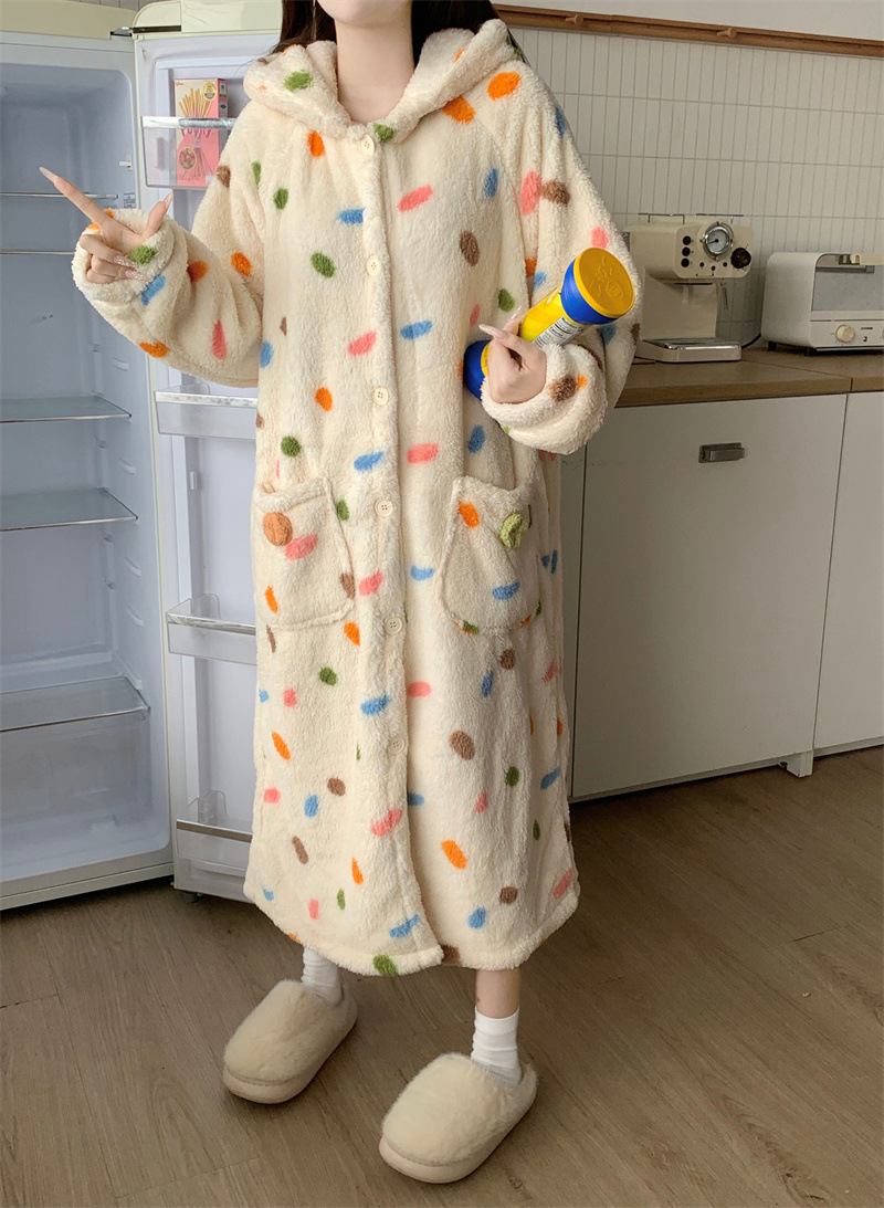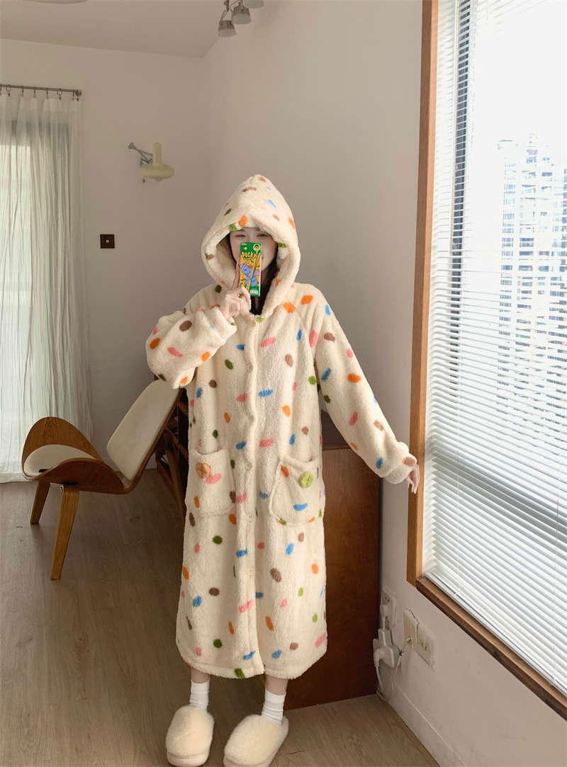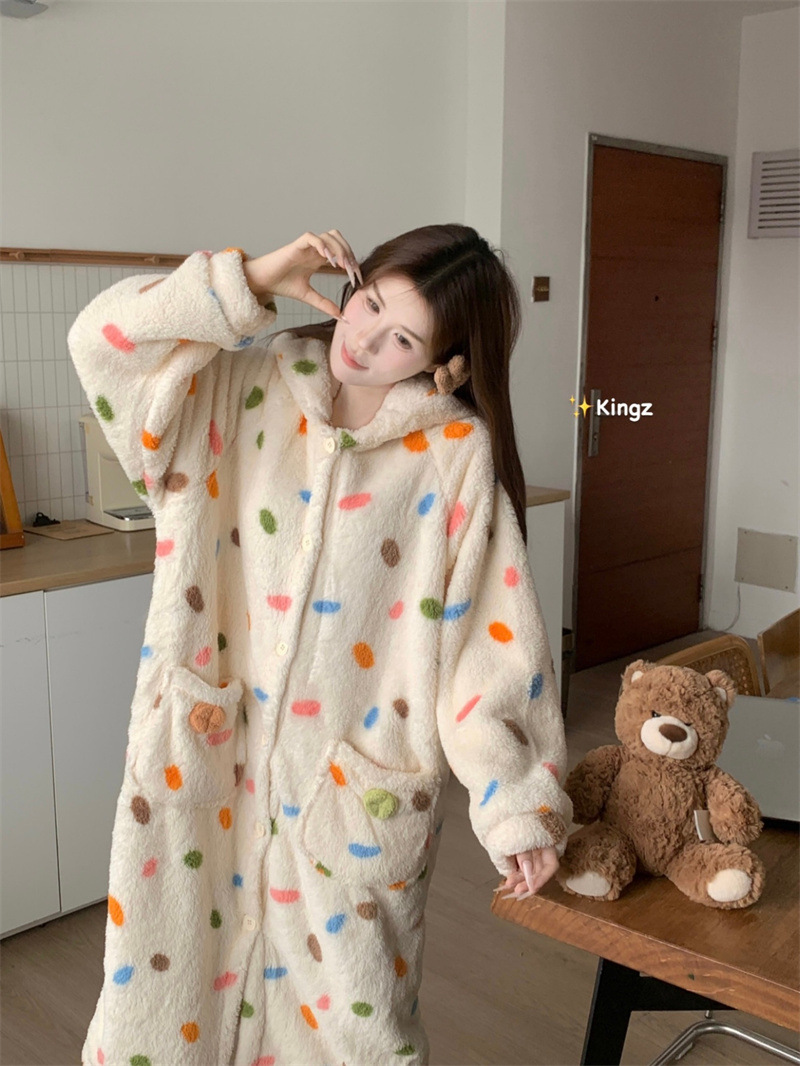 2024年の新型カラー韓国版の甘くて可愛い色の波点の寝衣の長いネットの赤い冬のパジャマの女性の絨毯の家の服