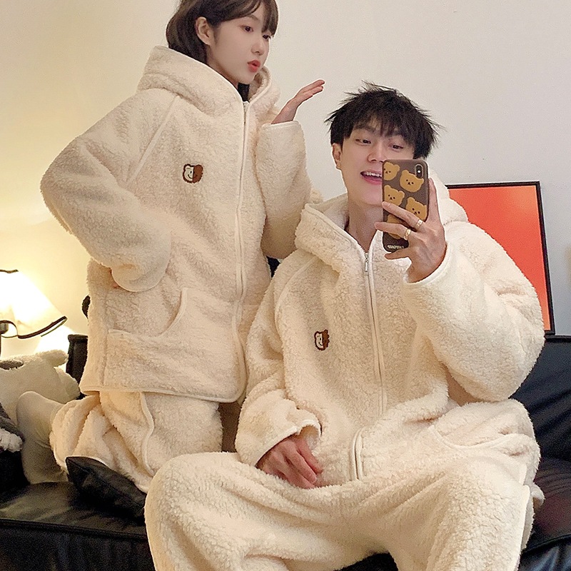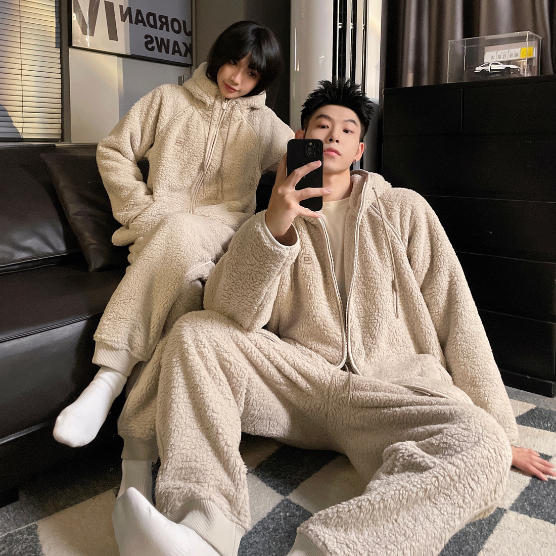 2024冬のベルベットのカップルの子羊のベルベットの帽子付きジッパーはシンプルで上品な多色の女性パジャマの家の服は外に着ることができる