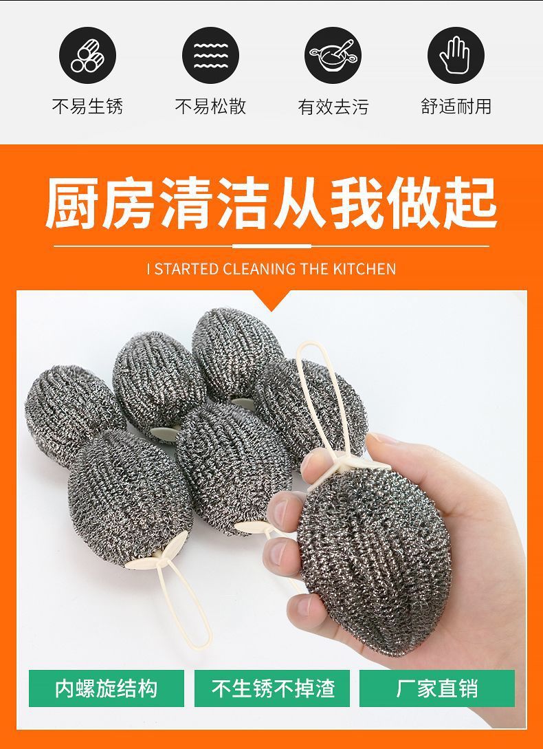 大きいサイズの暗号化ワイヤーボールは紐を持っています。番号を大きくしてボールをきれいにします。台所で鍋を洗って油汚れの神器を洗います。錆びません。