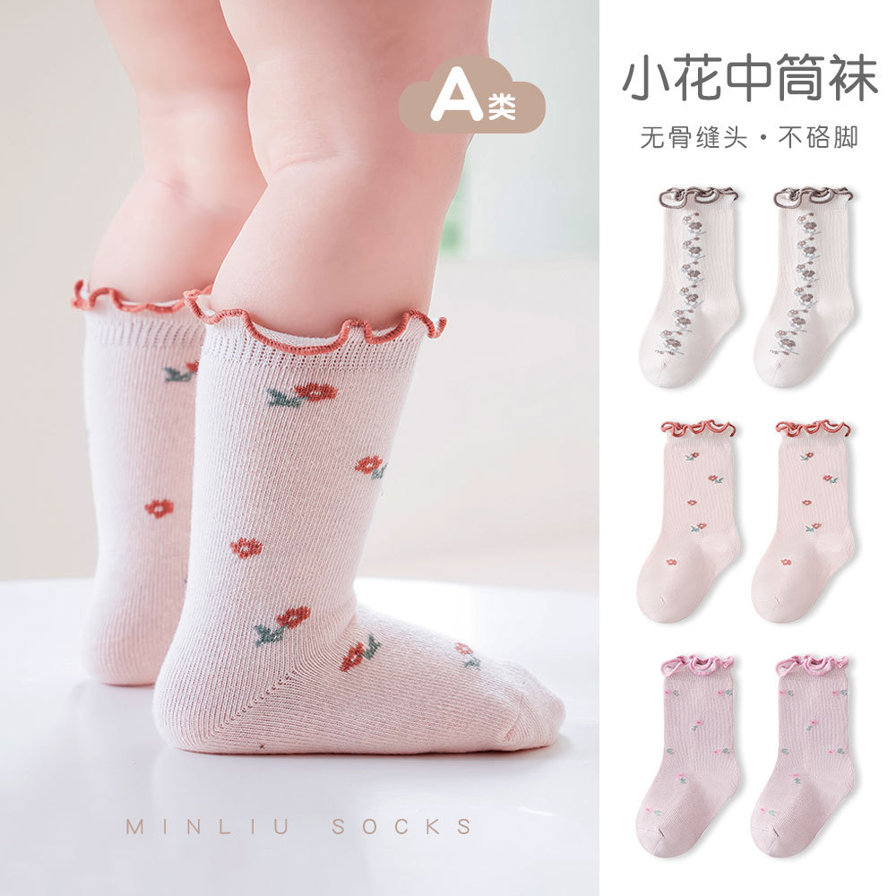 敏榴秋冬季宝宝中筒袜子婴幼儿童袜纯色木耳边婴儿袜子松口加绒袜