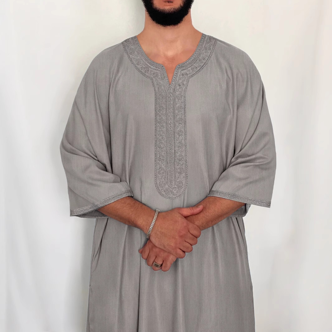 2025新型中東レトロムスリム中袖刺繍民族風モロッコ男性ローブサイドポケット