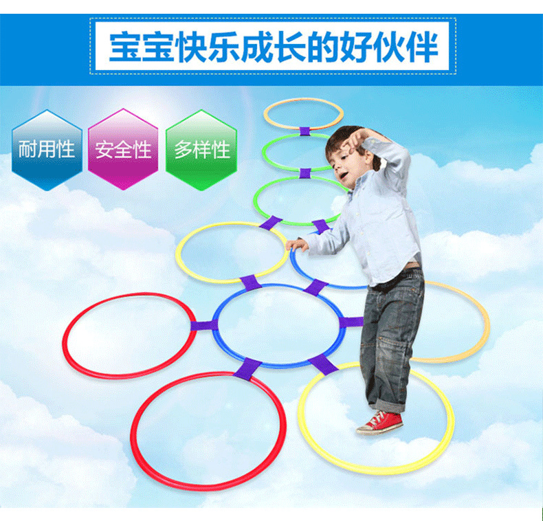 幼稚園の教具の子供は家を跳んで格子を跳んで輪を跳びます。