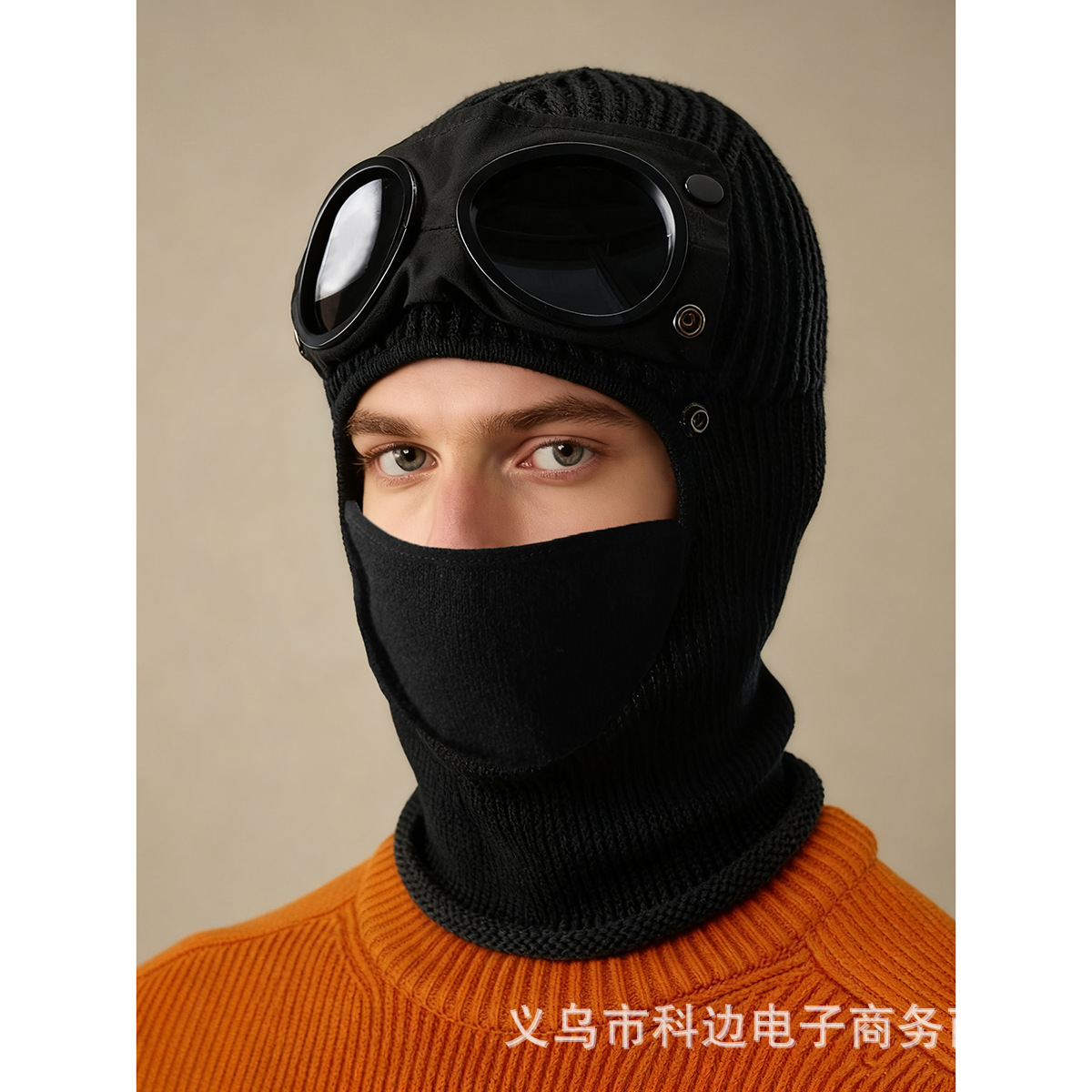 独立站跨境冬季新品飞行员镜片拼接针织帽男女时尚防风保暖套头帽