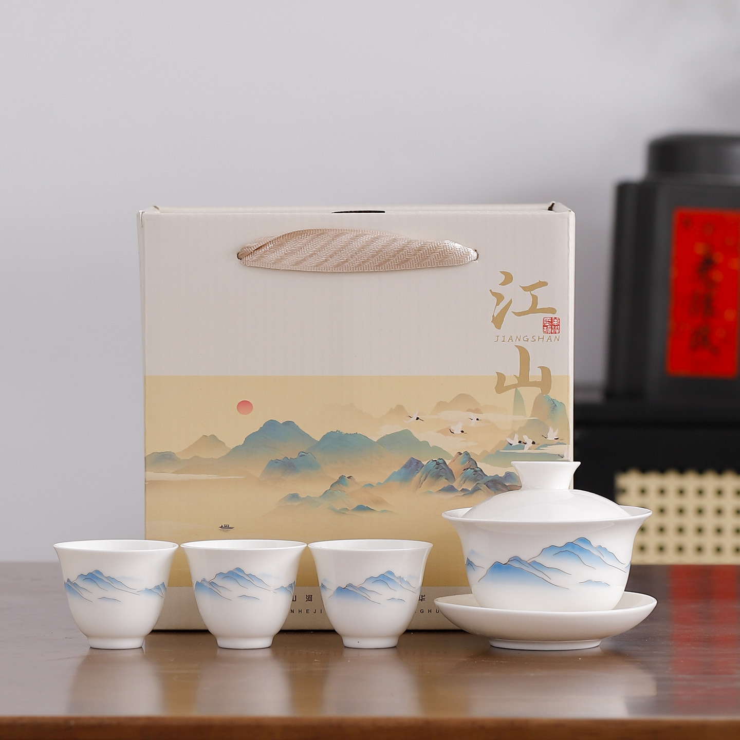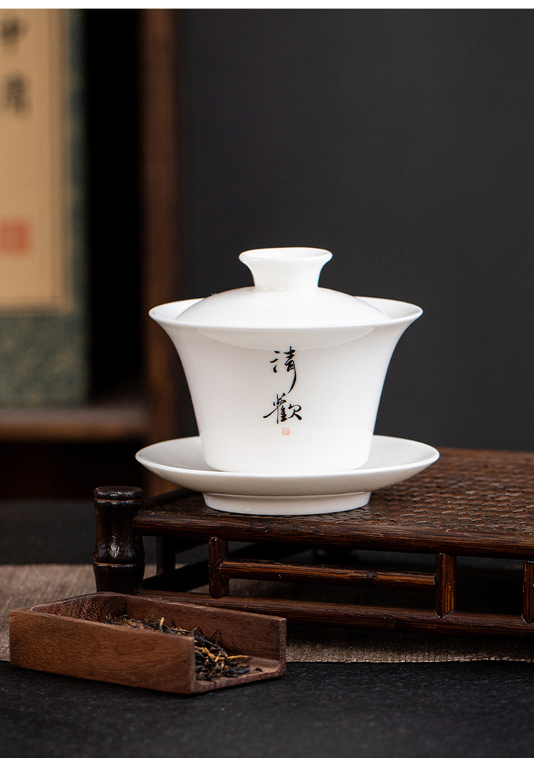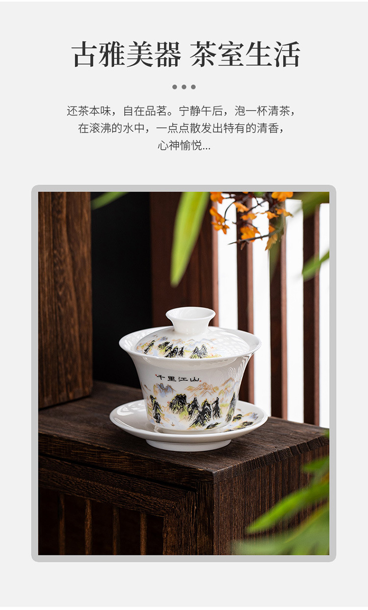 大サイズ山水三才蓋碗羊脂玉磁器白磁高級陶磁器茶器泡茶専用敬茶碗定logo