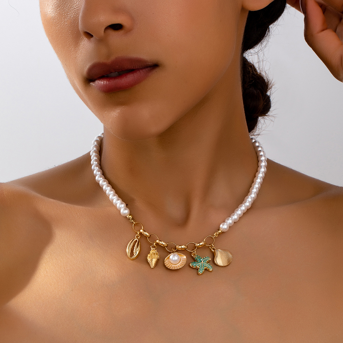 1 個のエレガントでファッショナブルなオーシャンシリーズシェルヒトデとコンクペンダントネックレス女性着用