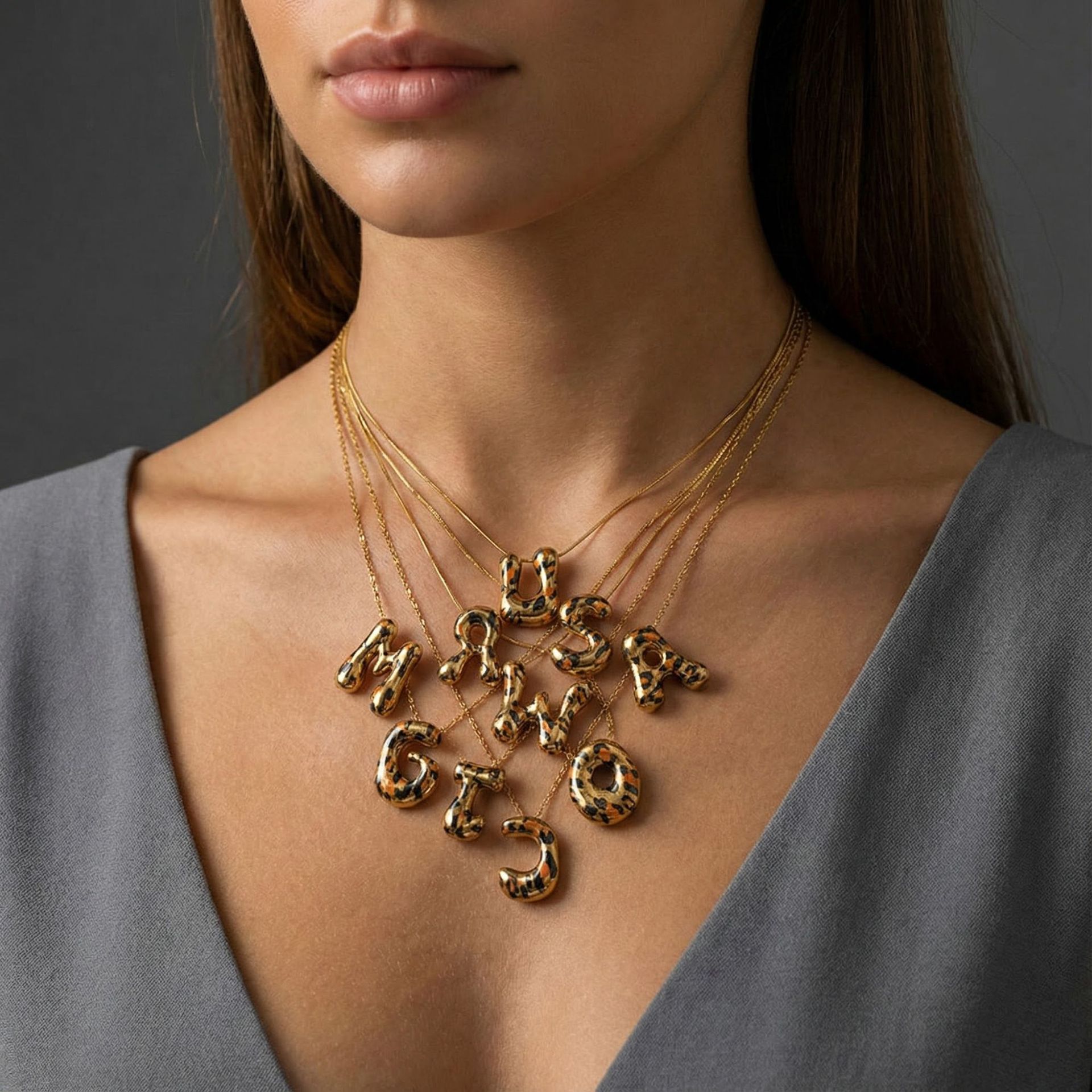 不锈钢26个英文豹纹字母吊坠项链金色胖乎乎气泡字母锁骨链项饰