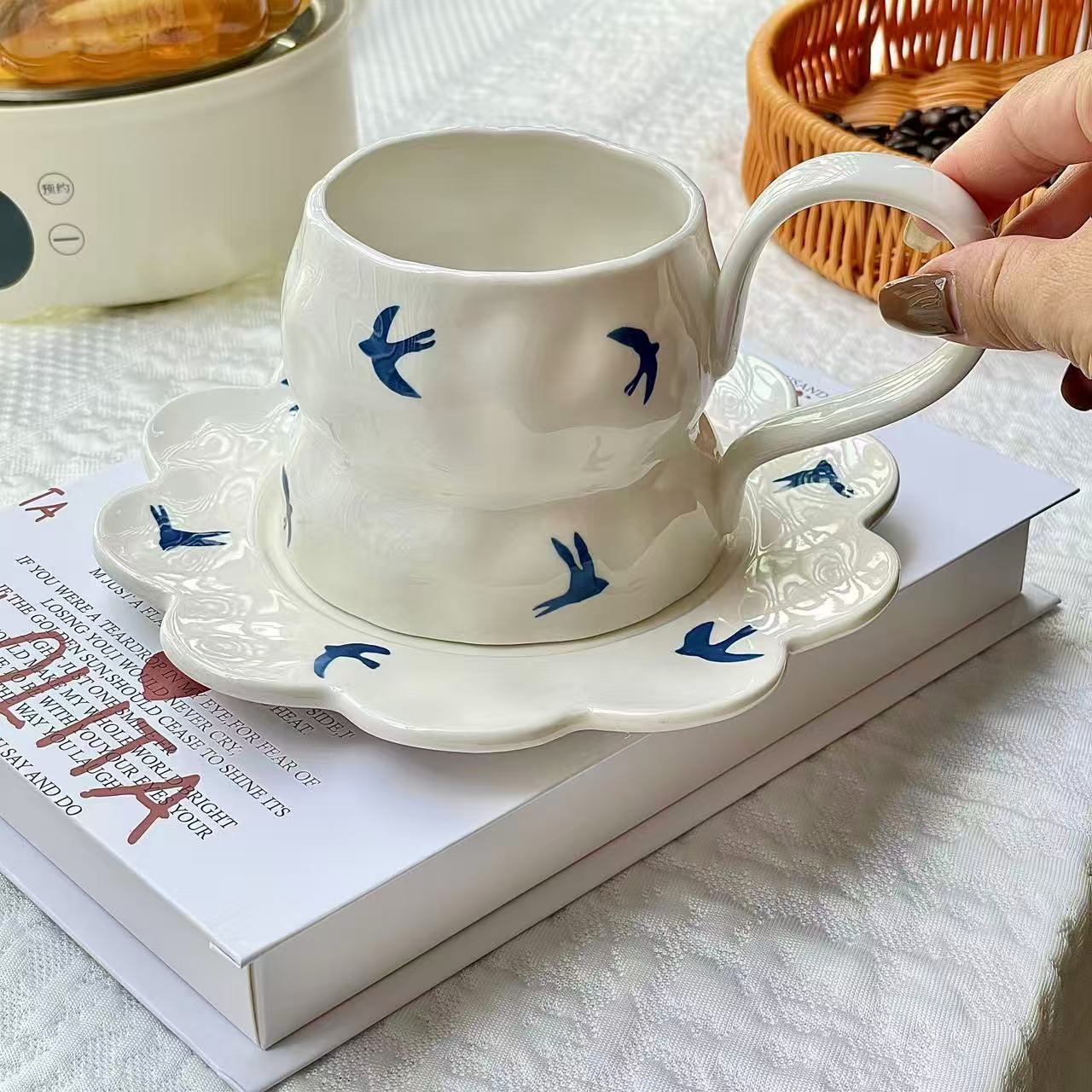 法式ins风 少女燕子陶瓷咖啡杯碟手捏手绘不规则杯碟下午茶拿铁杯