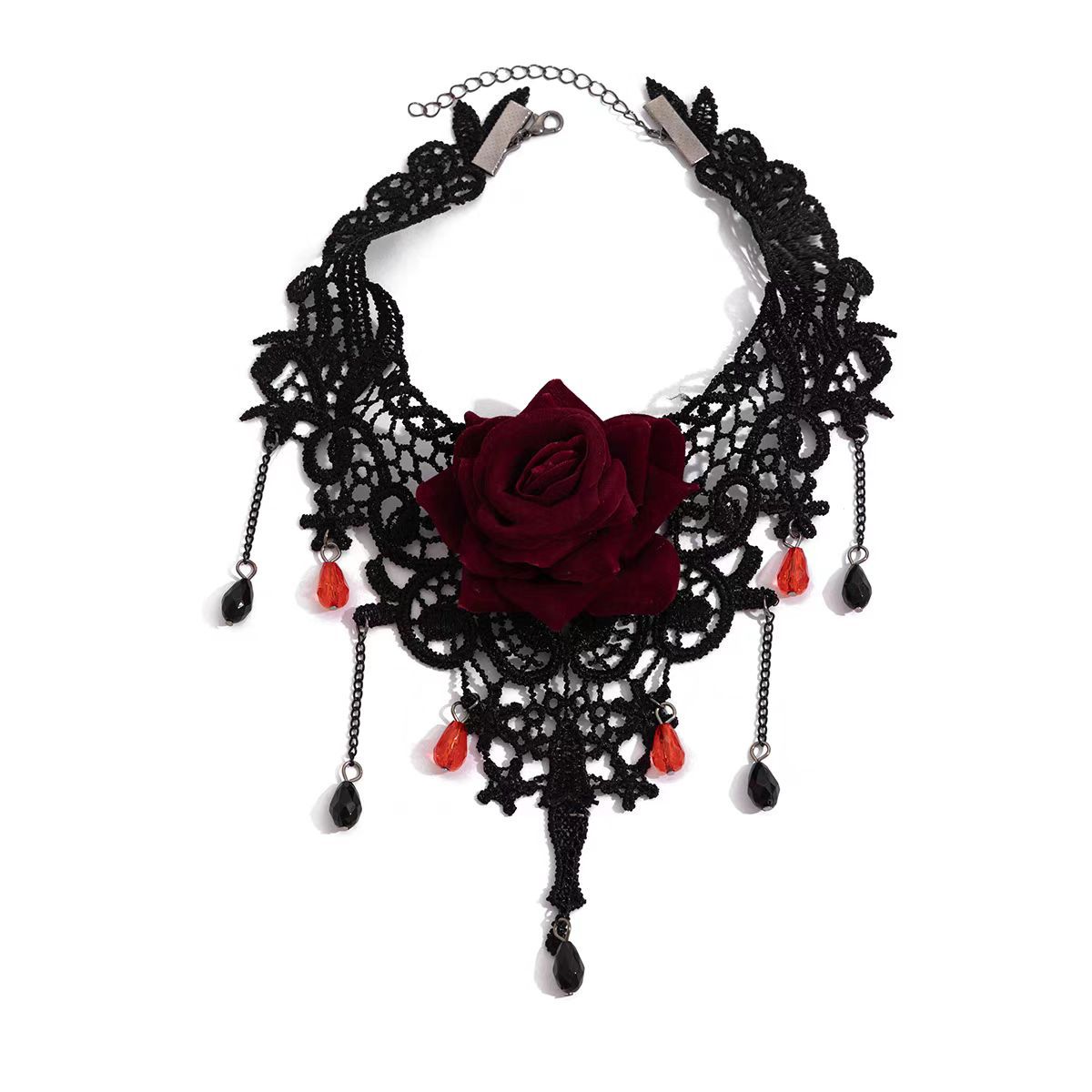 欧美跨境复古风暗黑系红玫瑰长款流苏项链哥特黑色蕾丝锁骨链项圈