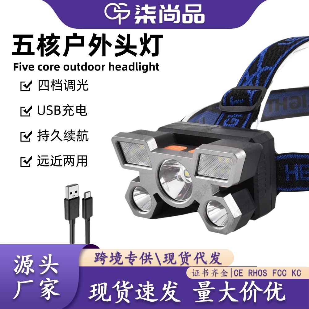 国境を越えた新型強光ヘッドライトled五頭飛行機ランプusb充電ヘッドセット小懐中電灯屋外鉱山ランプヘッドライト