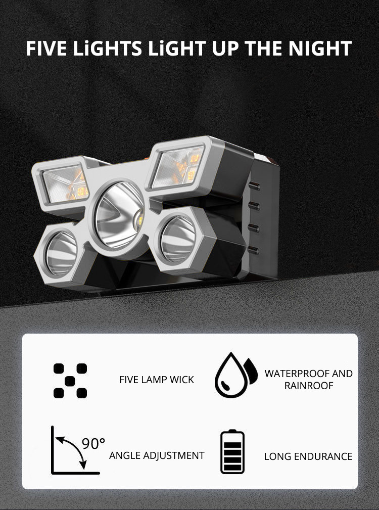 新しい強力なヘッドライト LED 5 ヘッド航空機ライト USB 充電式ヘッドマウント懐中電灯屋外マイナーズランプ集魚灯