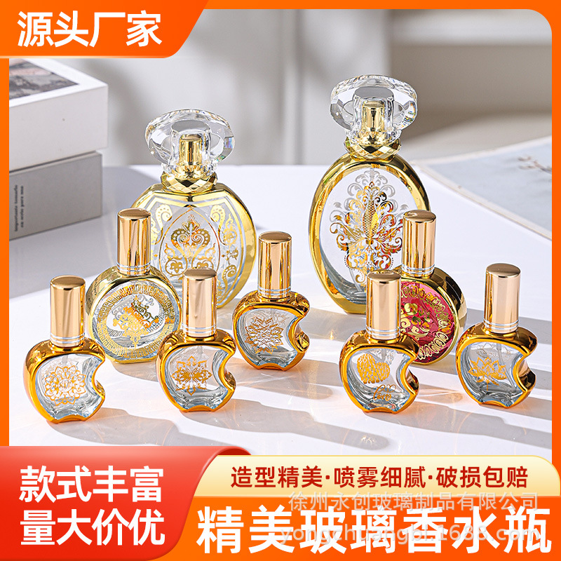 新款中东香水瓶金色电镀雕花香水喷雾瓶精油瓶丝印花纹香水分装瓶