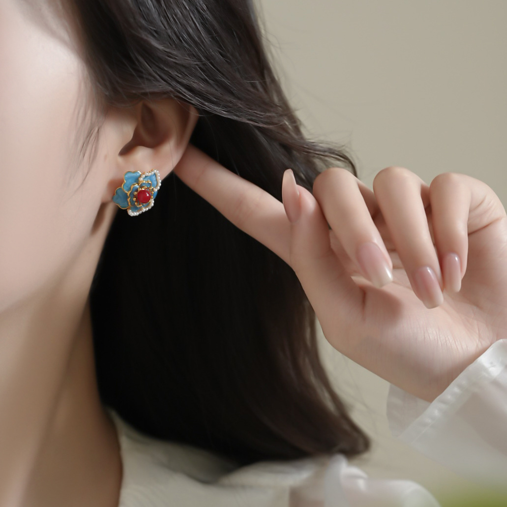 エナメルクラフトフィリグリー中国古典ジュエリーシンプルな花のイヤリング国民的トレンドパールステップチャイナドレスレディースイヤリング