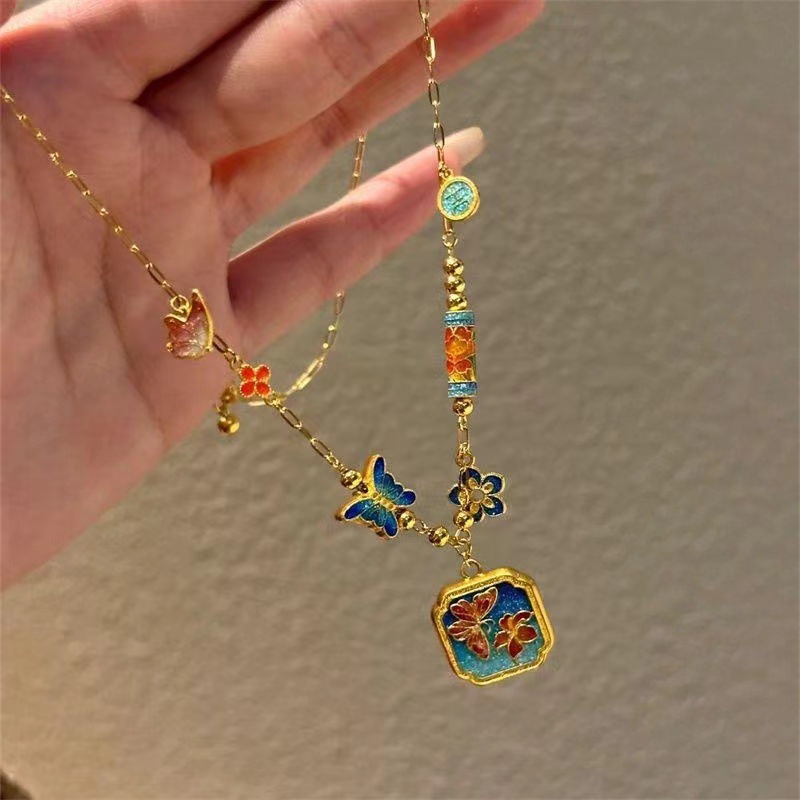 純銅金メッキエナメル蝶ネックレス軽豪華小衆高級感精致古風セーターチェーン女性誕生日プレゼント