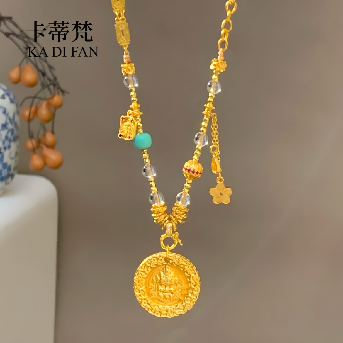 リアルゴールドメッキ高色保持サンドゴールド古代黄色の富の神ラウンドビーズネックレス新しい中国風のオリジナルデザインのセーターチェーン