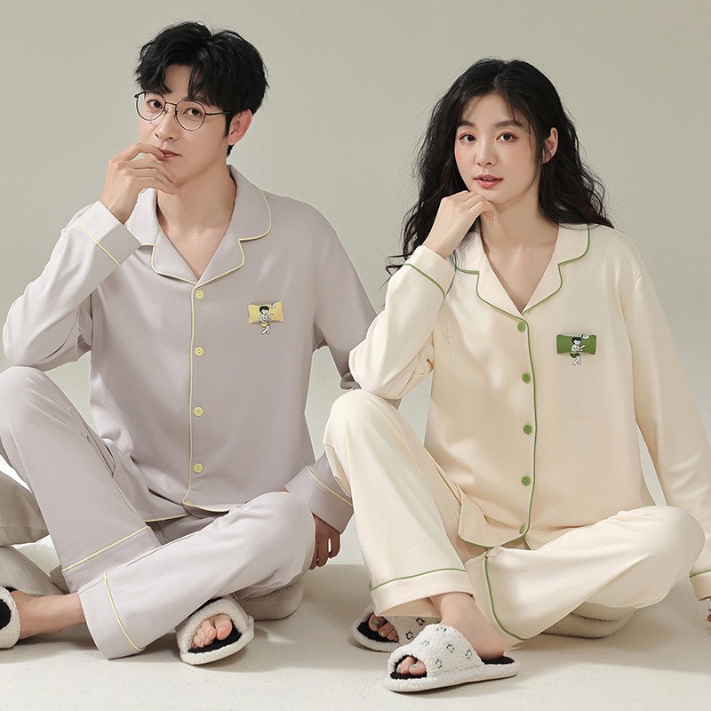 2025年新作カップルパジャマ 春秋用 純綿カジュアルホームウェア 襟付き長袖 軽贅沢風 綿100%ツーピースセット