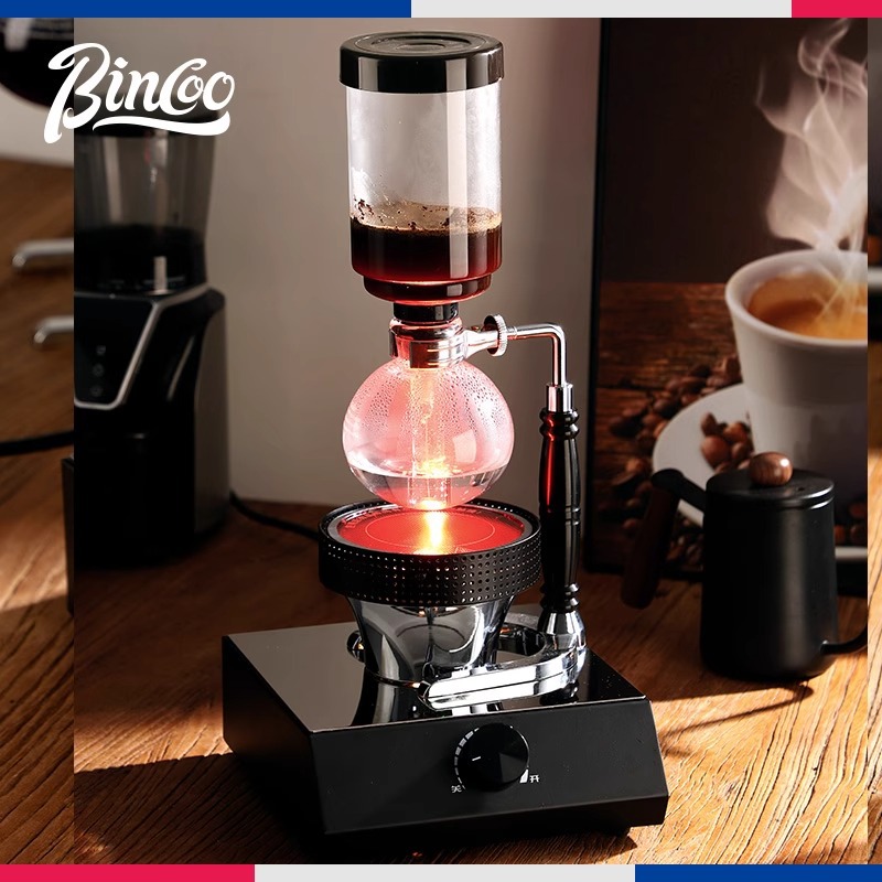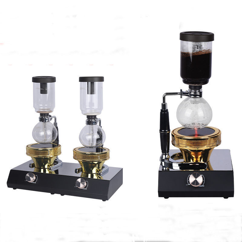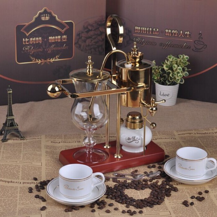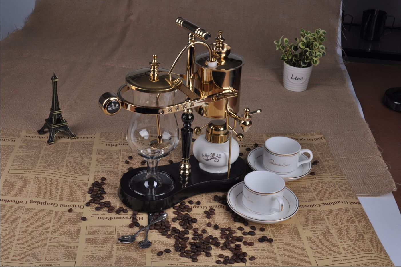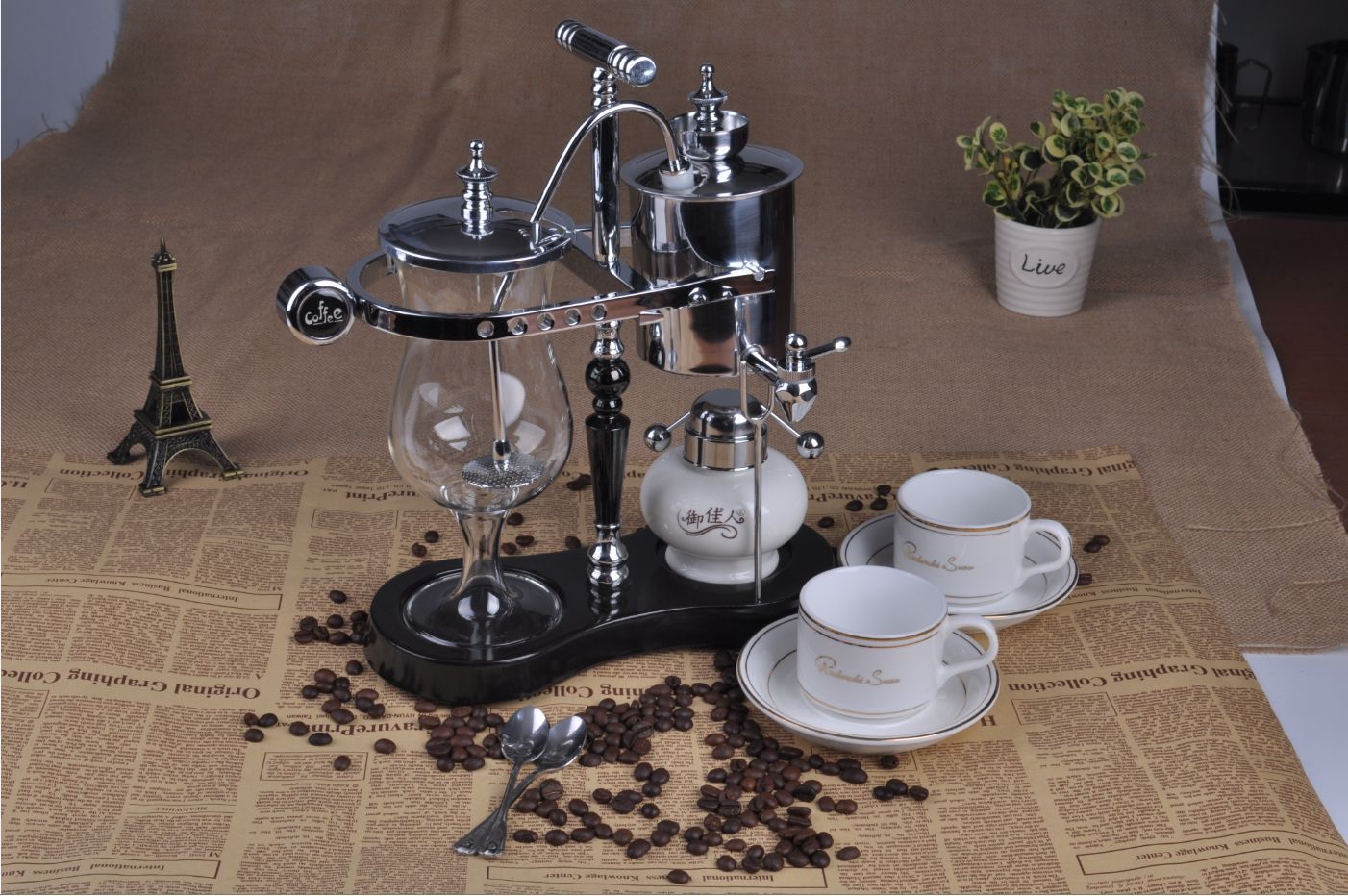 【原理】利用蒸汽压力原理,使被加热的水由下面的烧杯经由虹吸管和滤布向升,然后与上面杯中的咖啡粉混合,而将咖啡粉中的成分完全萃取出来,经过萃取的咖啡精华,再降温后使下层呈类似的真空状态来吸取上层已煮好的咖啡,以中间的滤布过滤残渣,再回流到下壶.