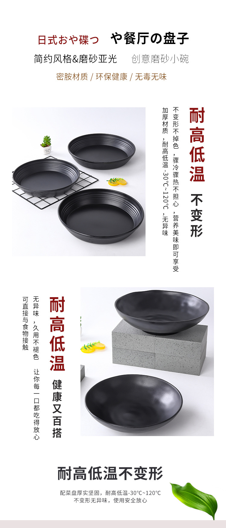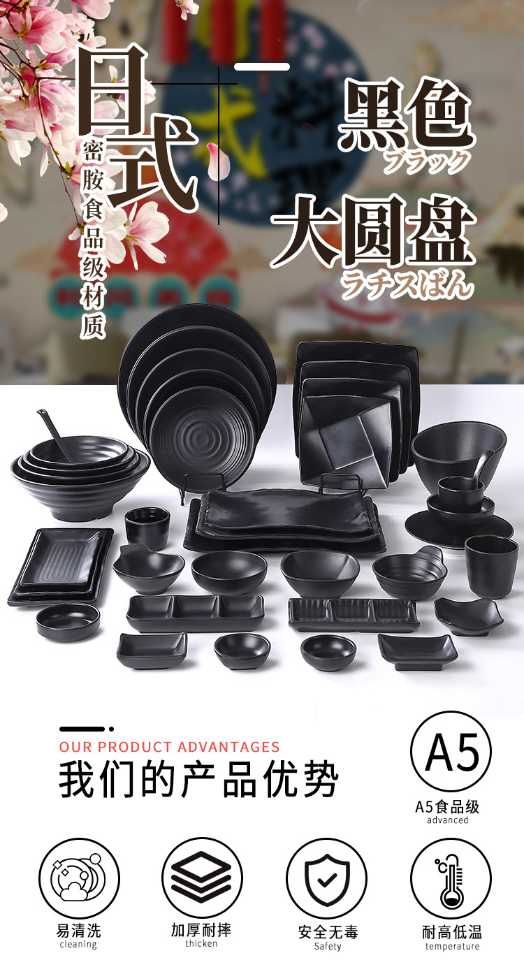 メラミンの碗の食器の店は黒色の磁器のプラスチックのラーメン屋のスープの碗の皿の家庭用の商用の笠の碗の卸売りを使います。