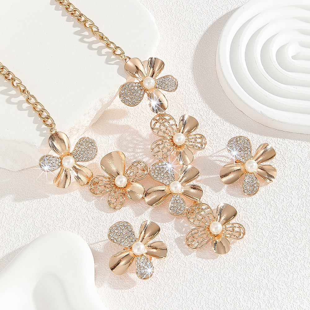 欧米の人気のある金色の亜鉛合金は白いダイヤモンドの金属の花のネックレスのイヤリングのセットの女性のアクセサリーを象眼します。
