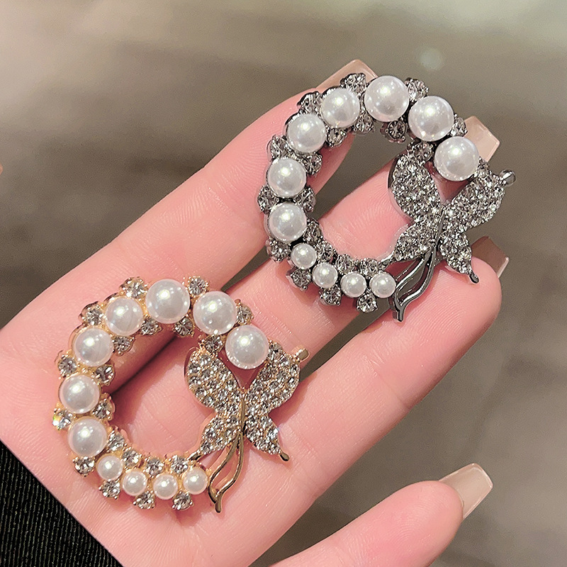 韓国東大門製、ダイヤモンドとパールをあしらった蝶のブローチ、露出防止ピン、ファッショナブルで高級感のある服飾用固定ピン、アクセサリー