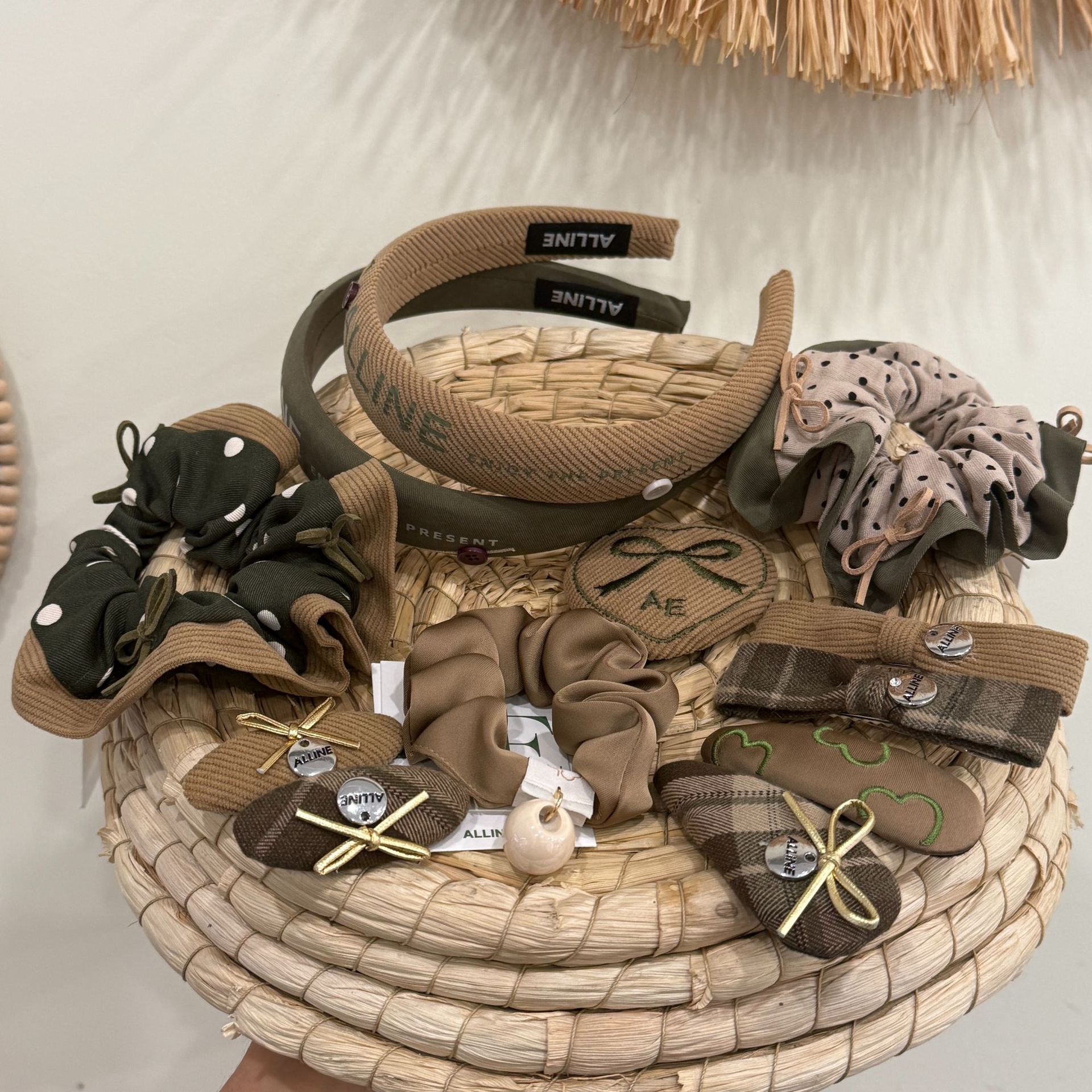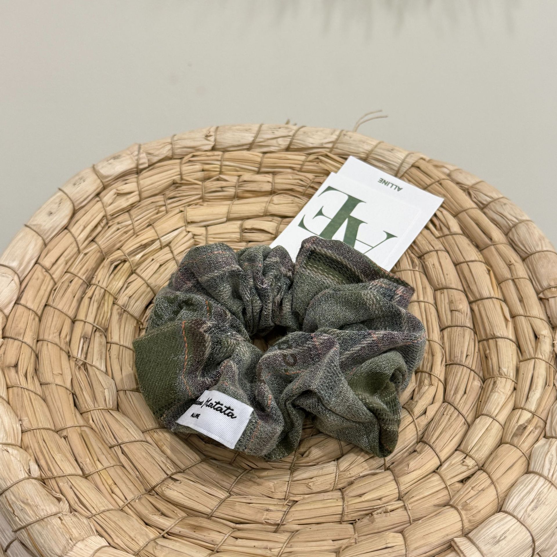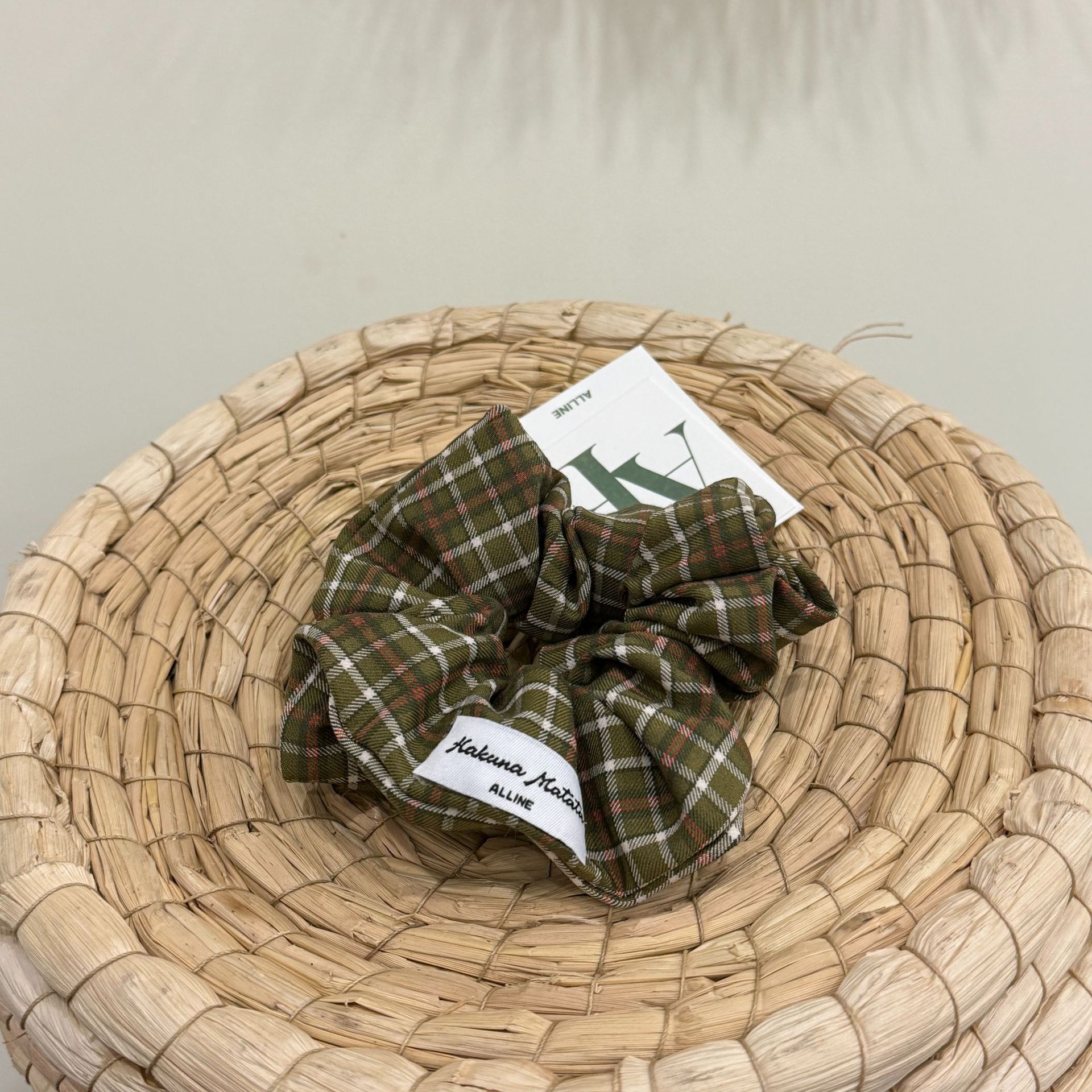 ダークグリーンと白のヘッドバンド,グレーと白のチェック柄のヘッドバンド,ダークグリーンのコーヒーのヘアゴム,緑、白、ピンクのチェック柄のヘアゴム,ダークグリーングレーのヘアゴム