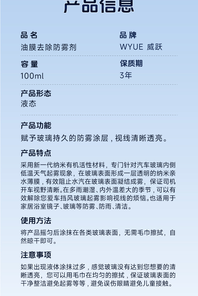 威躍自動車ガラス防霧剤フロントガラス油膜除去剤自動車ガラス油膜二合一防霧剤