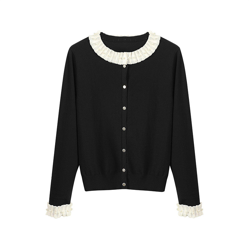 蕾丝翻领长袖撞色针织开衫女2025秋冬新款气质通勤羊毛呢百搭上衣