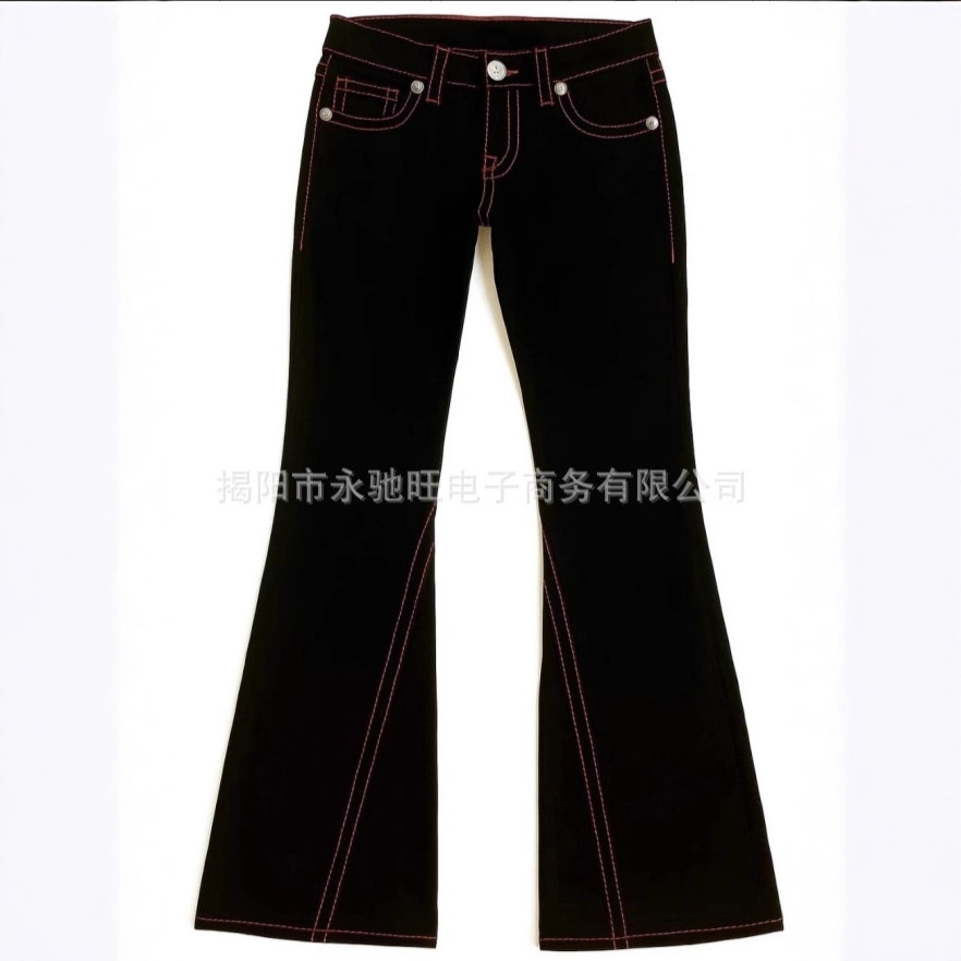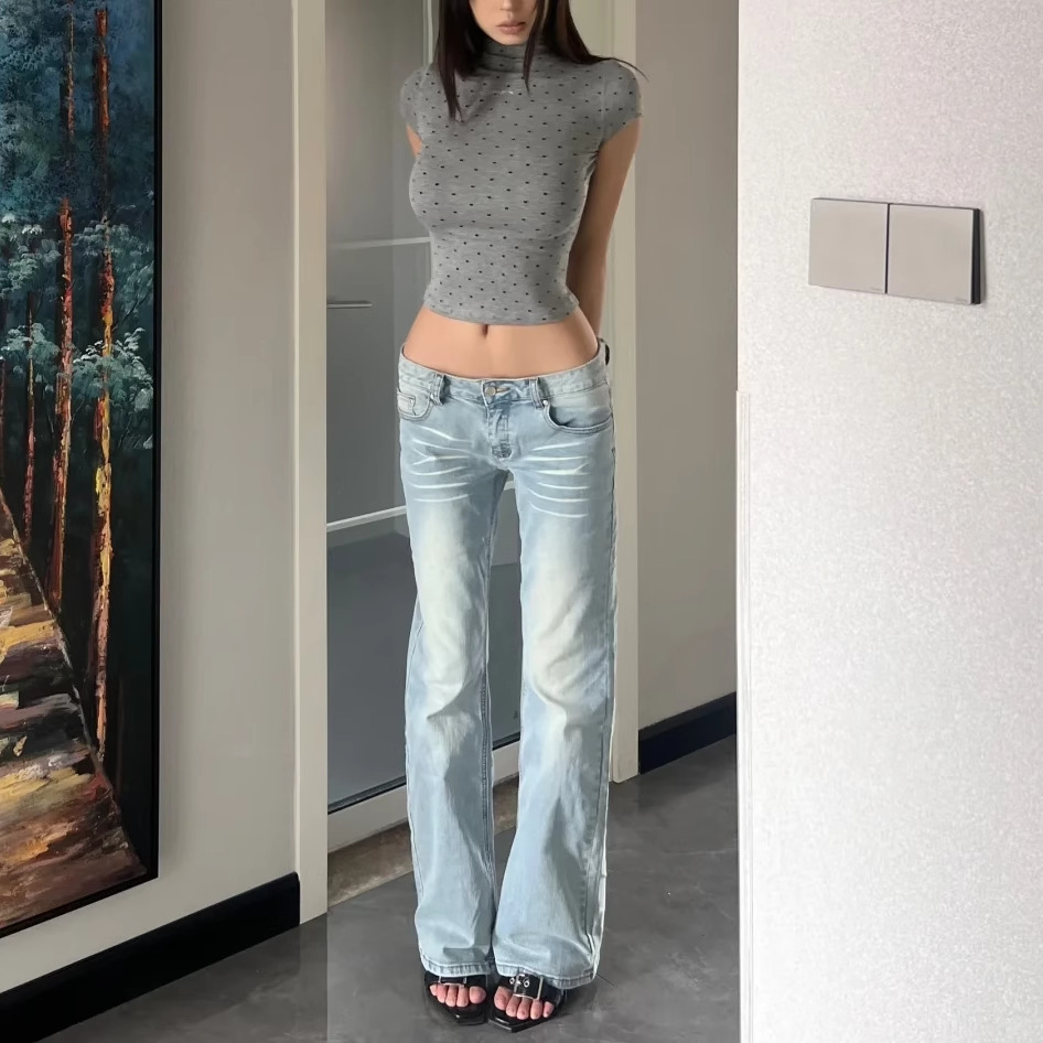ホットガールローウエストウォッシュドプリーツマイクロフレアジーンズレディースアメリカンレトロダメージ加工スリムフィットフレアフロアレングスパンツ