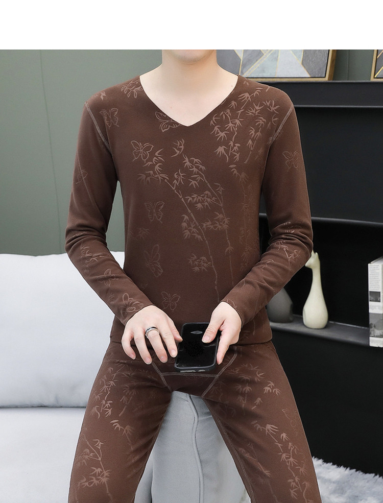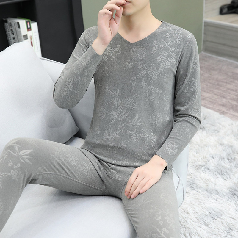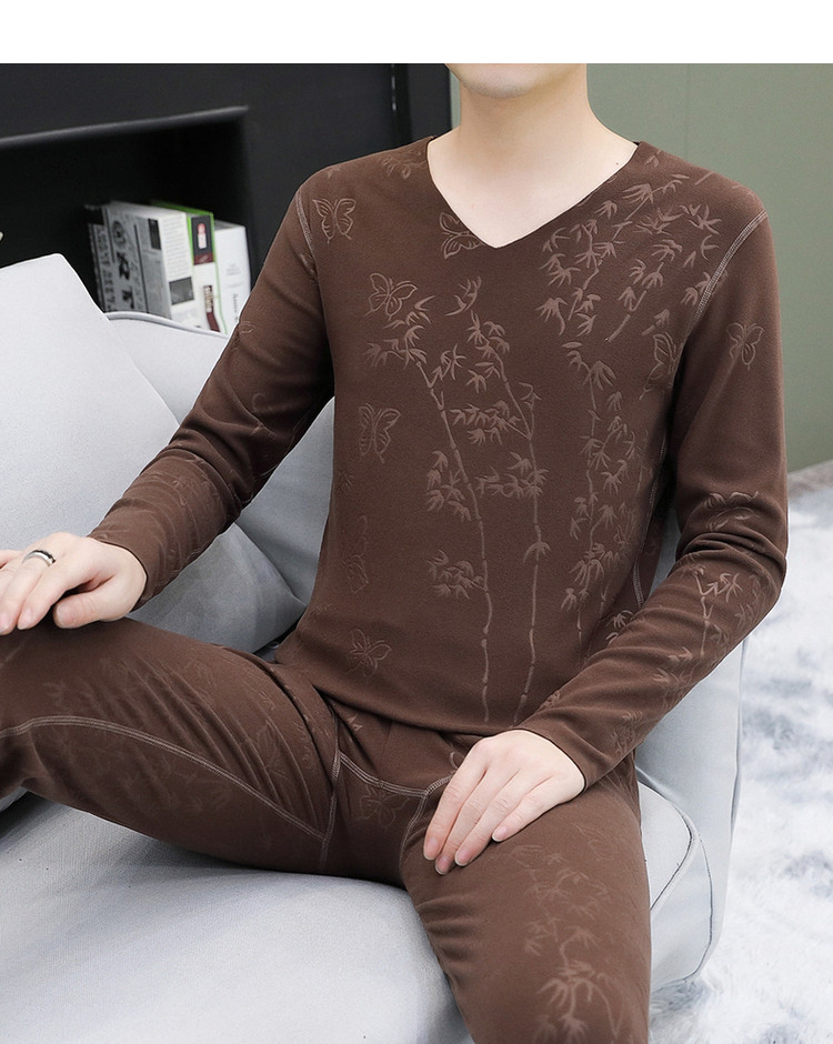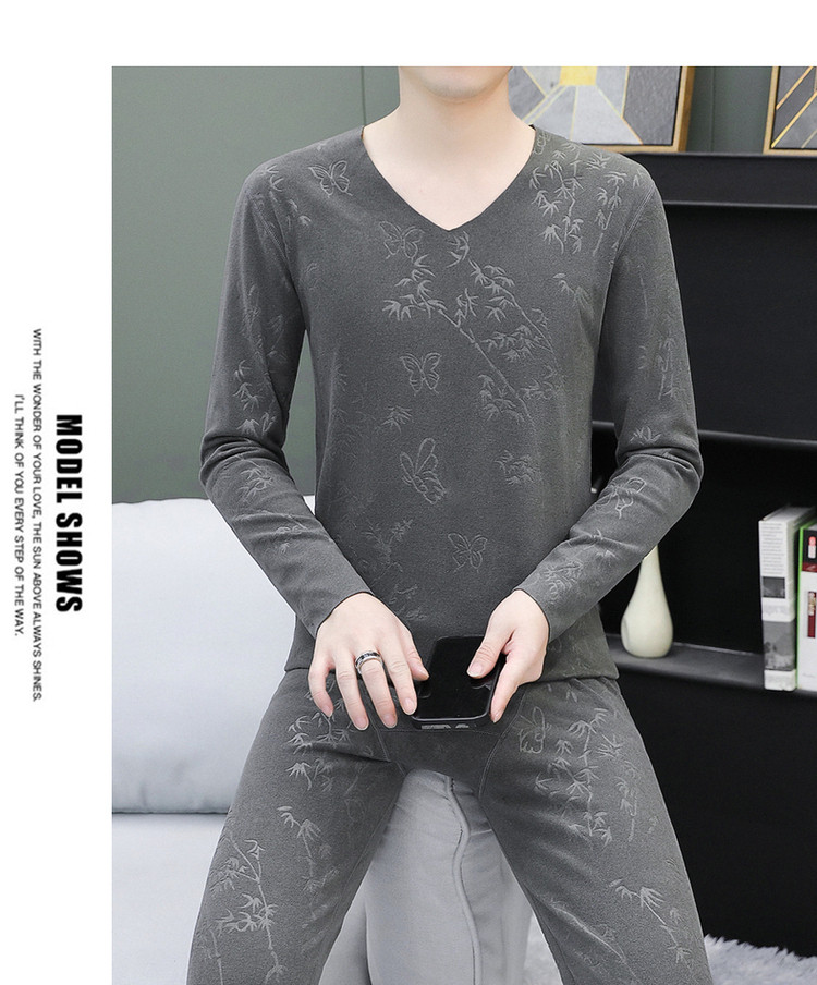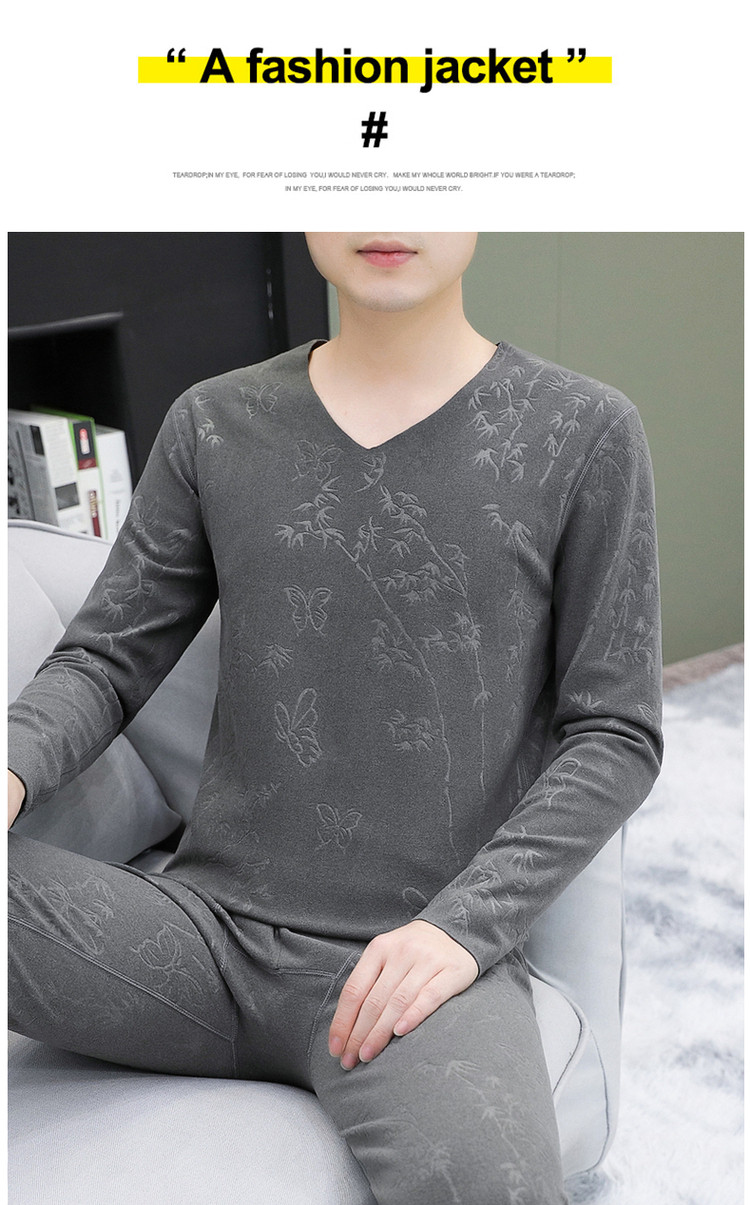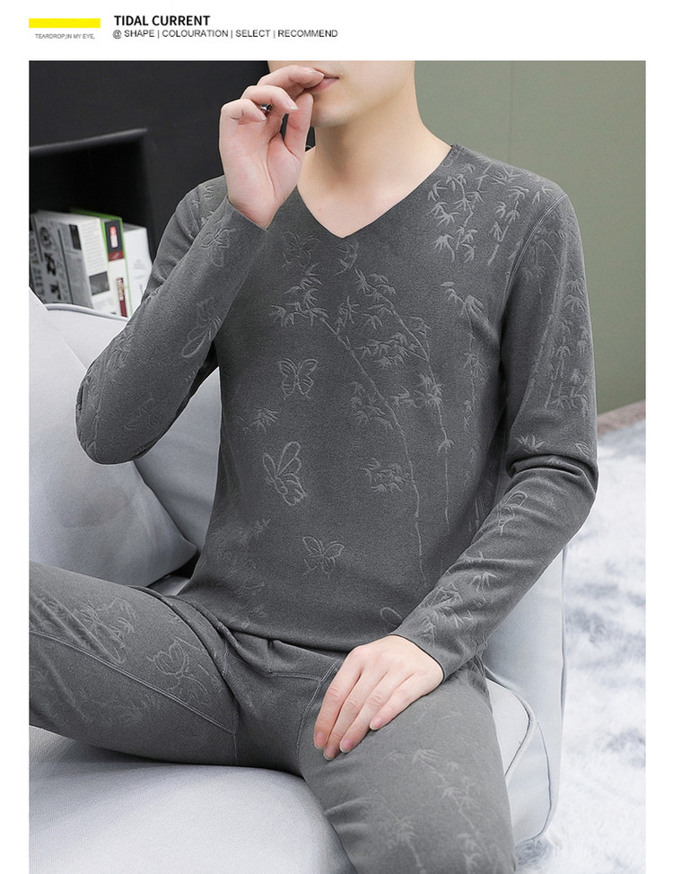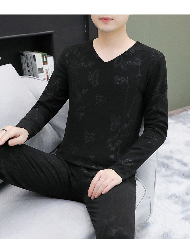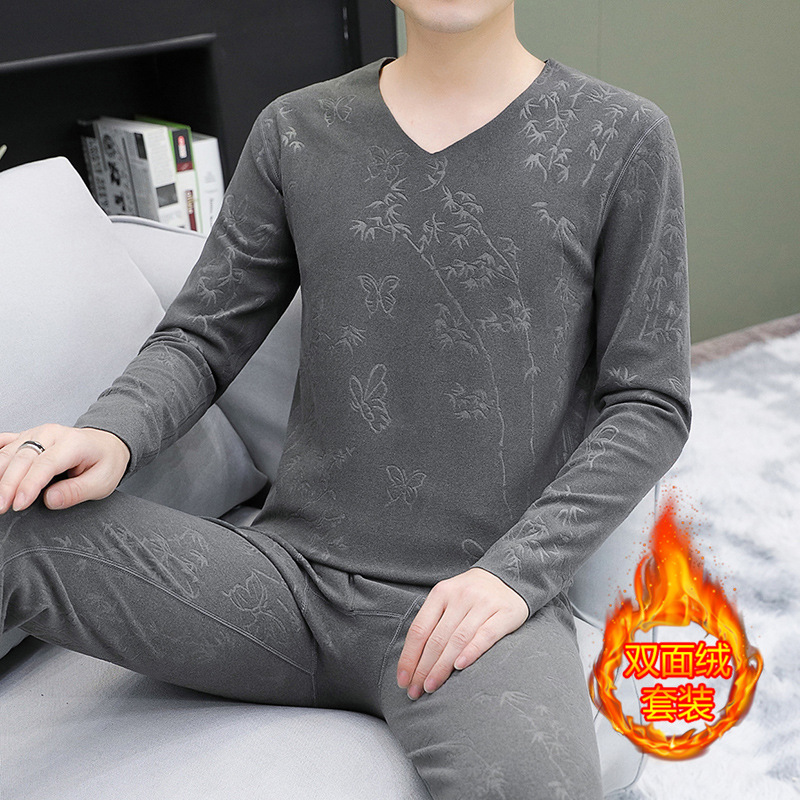 秋冬男性無痕保温セット加毛修身5A抗菌vネックエンボスプリント磨毛秋衣秋ズボン