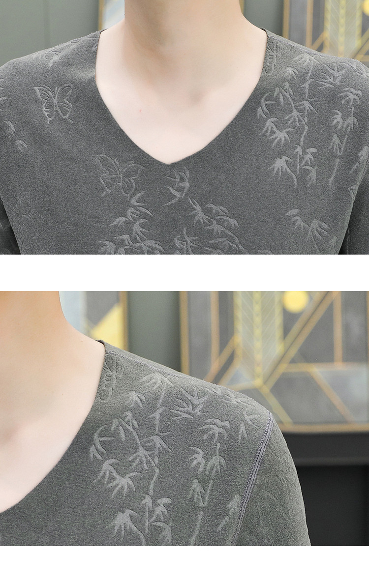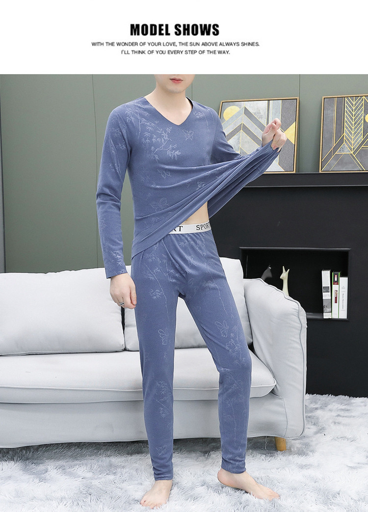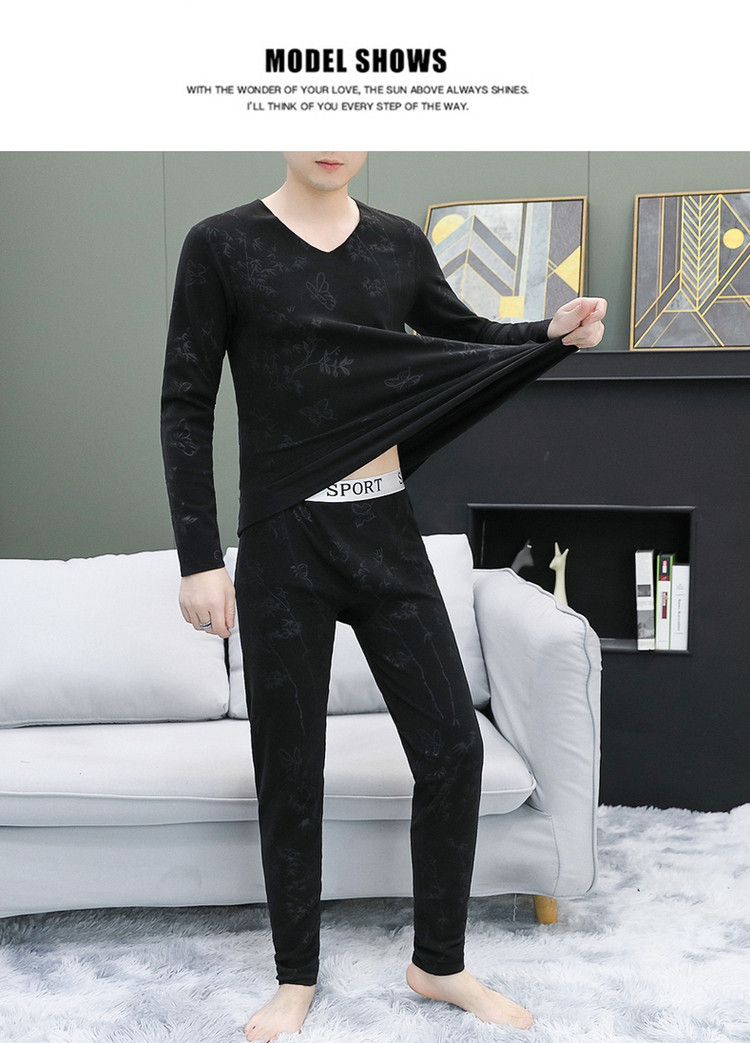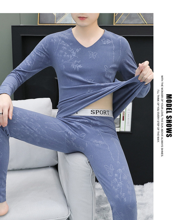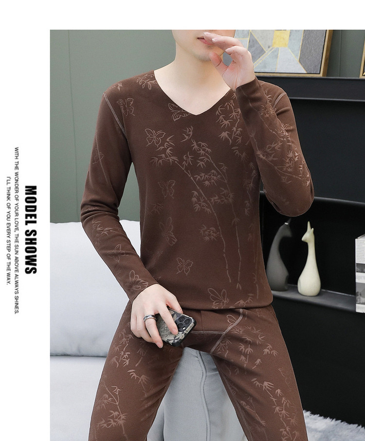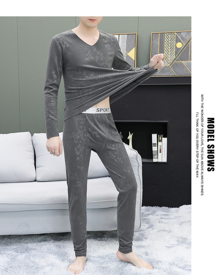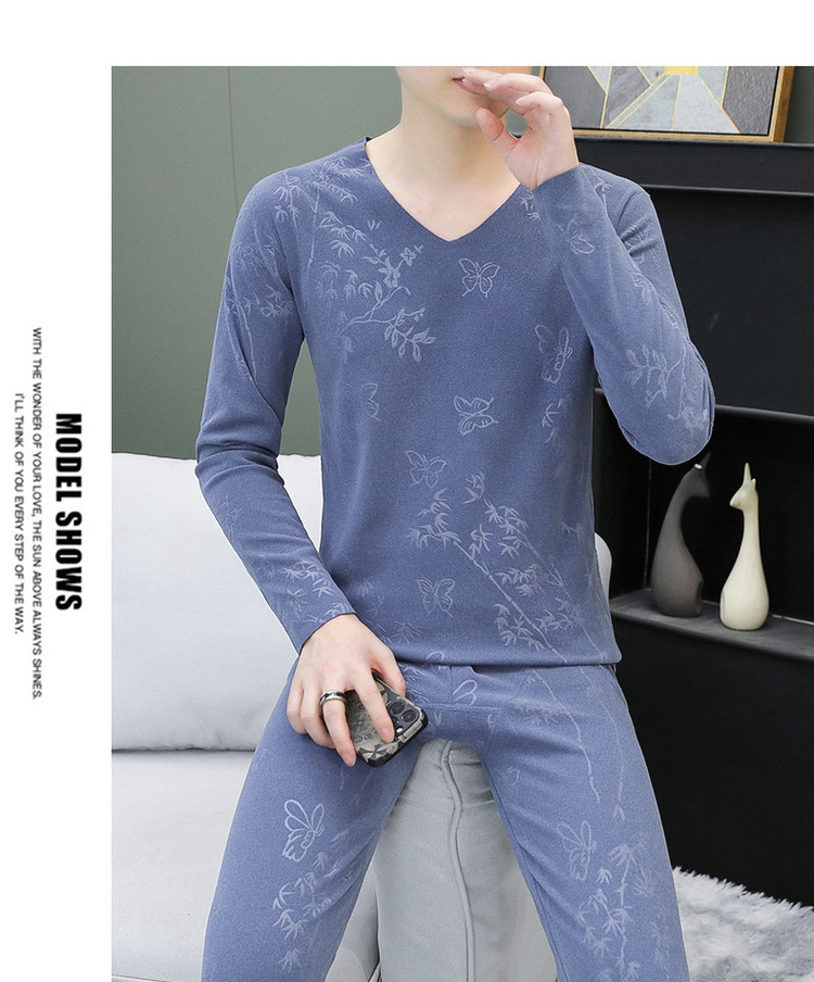 秋冬男性無痕保温セット加毛修身5A抗菌vネックエンボスプリント磨毛秋衣秋ズボン