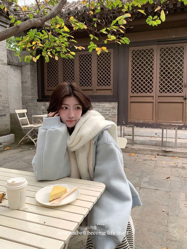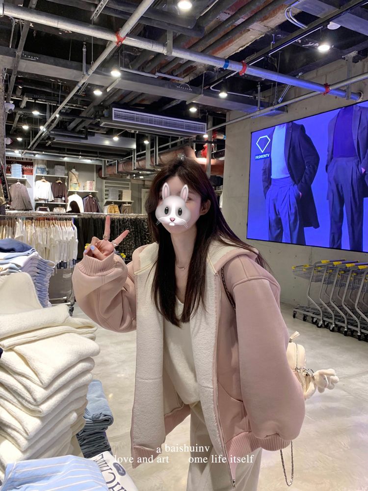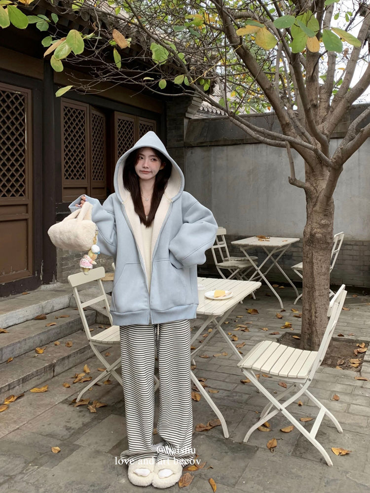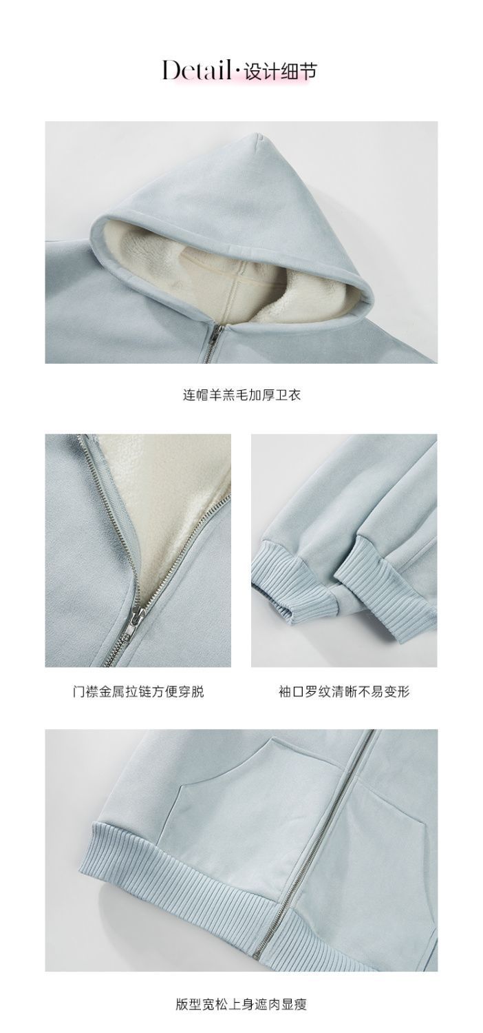 皮毛一体羊羔毛加绒外套女冬季新款淡蓝色鹿皮绒棉衣加厚夹克棉服