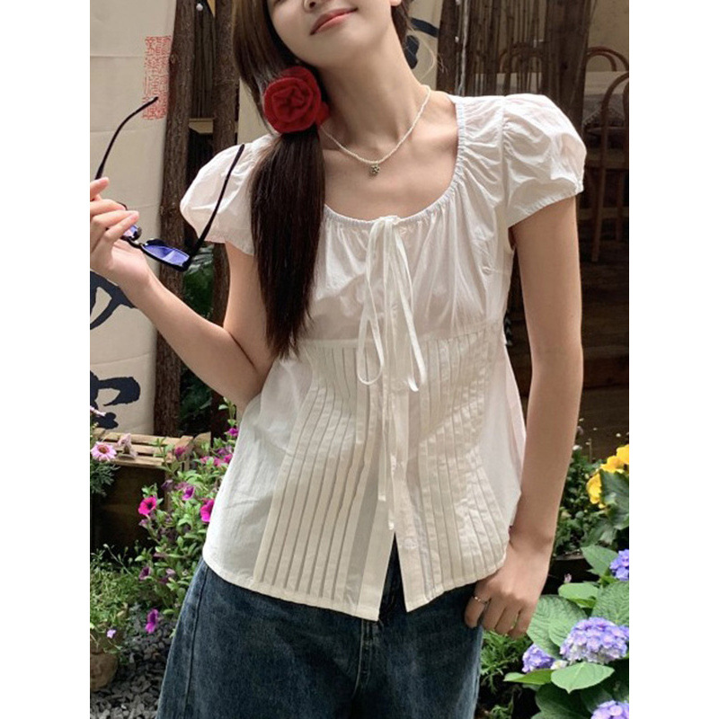 ホワイトパフスリーブシャツ女性のための 2025 夏の新しいルーズスリムレースアップシャツデザイン U ネックトップ夏