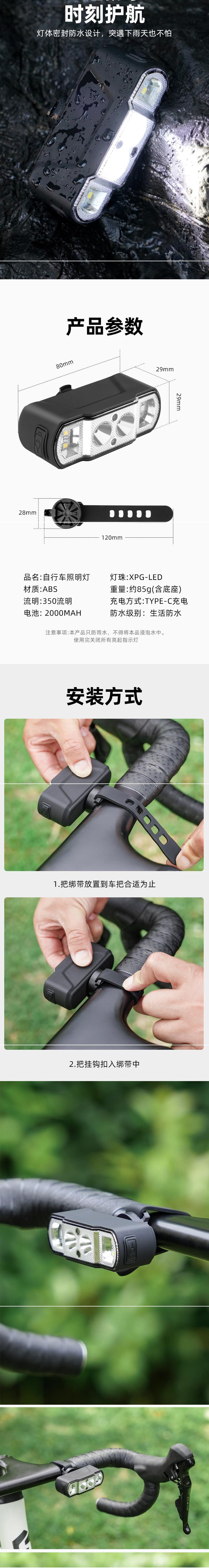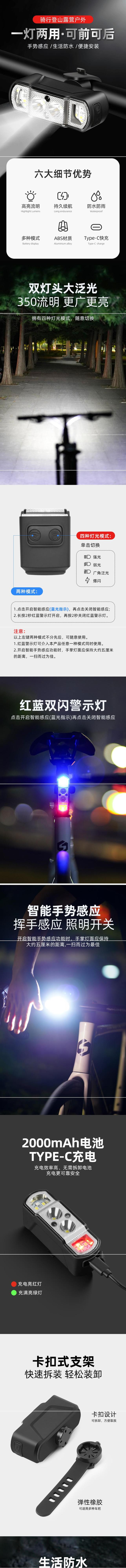 多機能前後ライト [350 ルーメン 2000mAh] ジェスチャーセンサースイッチ