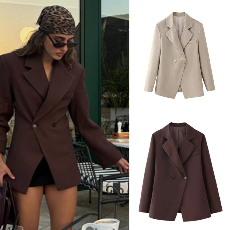 2色クロスボーダー欧米女装速売通起爆襟高腰修身純色ボタン非対称スーツコート