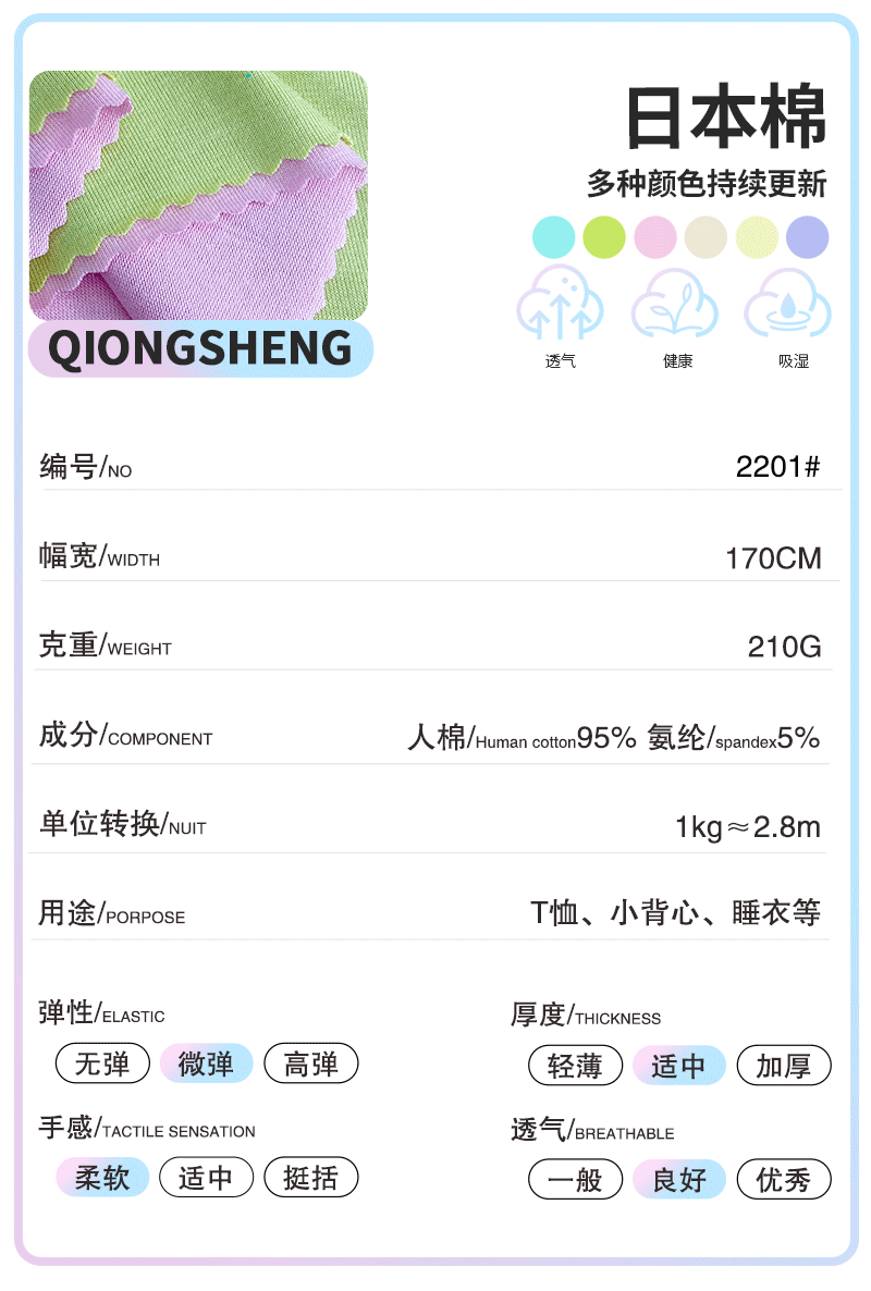 日本棉200g人棉弹力莱卡布黏胶纤维面料时装打底衫背心针织面料