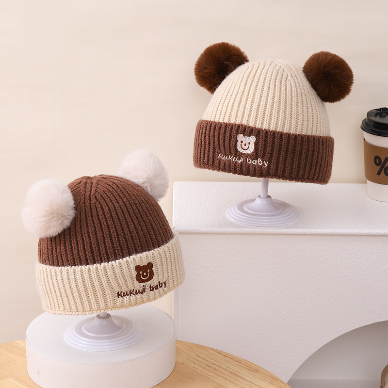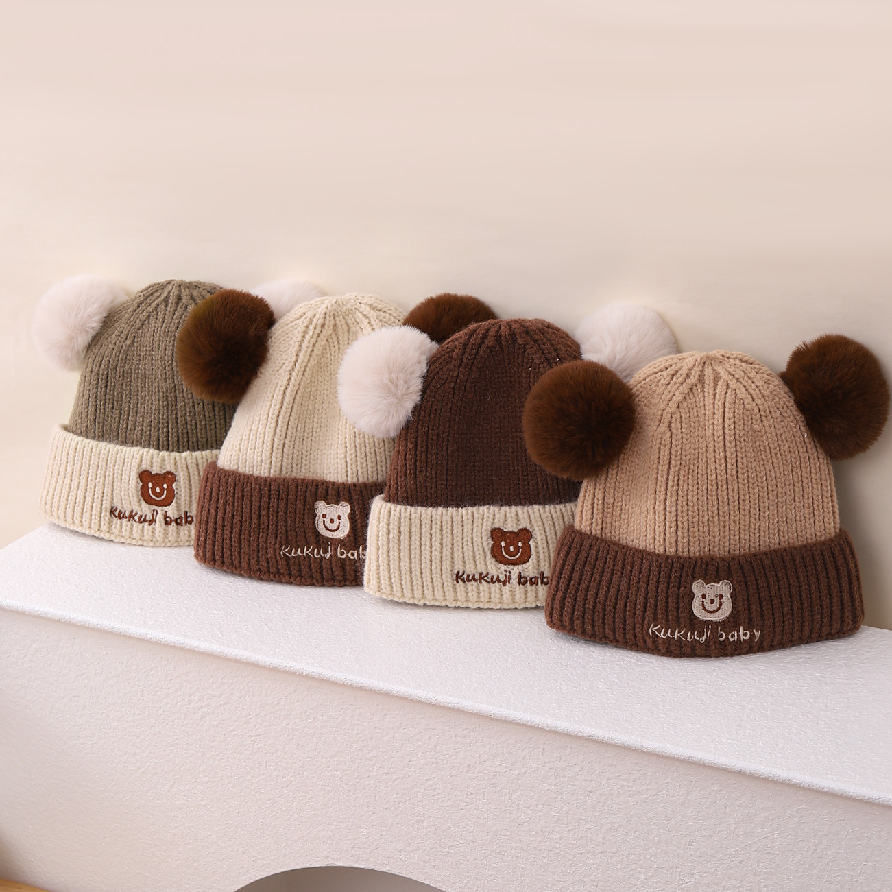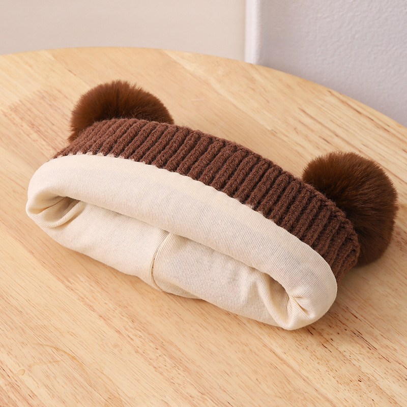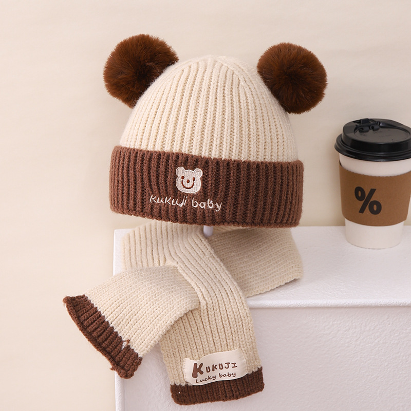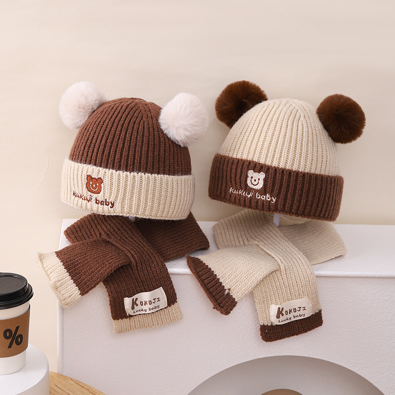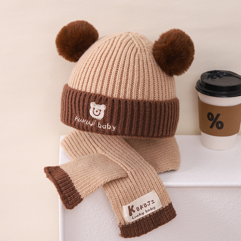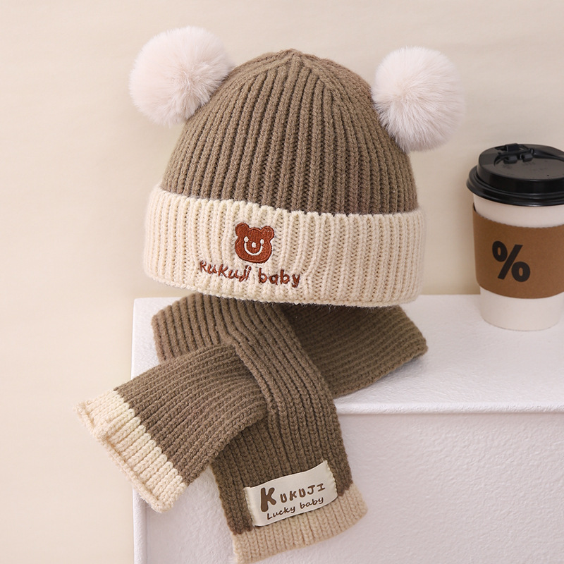 漫画の熊の耳のマフラーの帽子の2つのセットのかわいい赤ちゃんのニットの帽子の保温は子供の毛糸の帽子を厚くします。