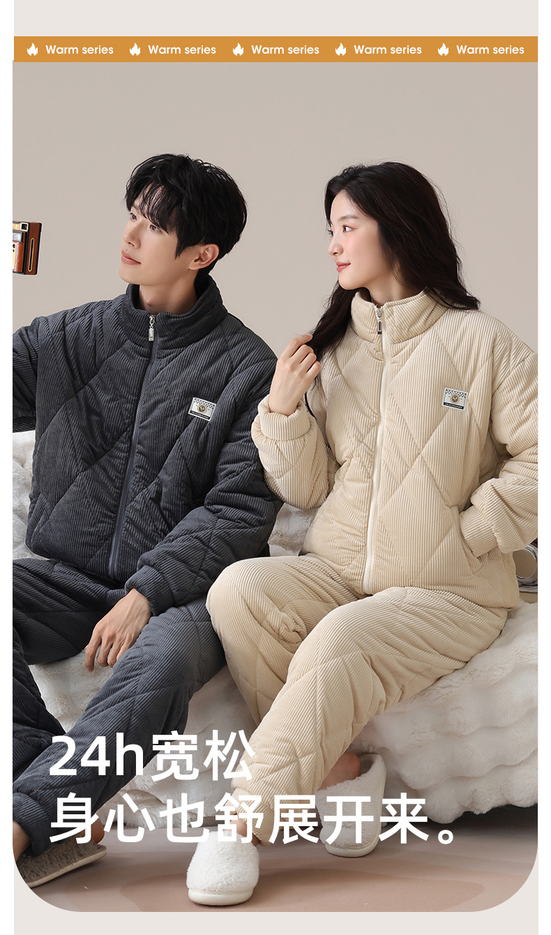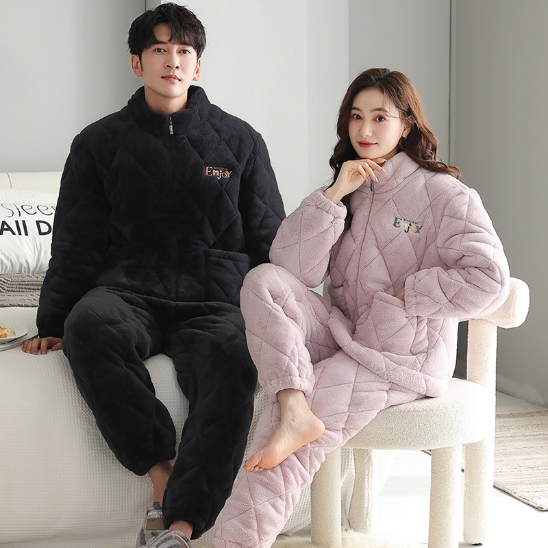 情侣睡衣冬季夹棉拉链款立领保暖三层加厚加绒秋冬款可外穿家居服