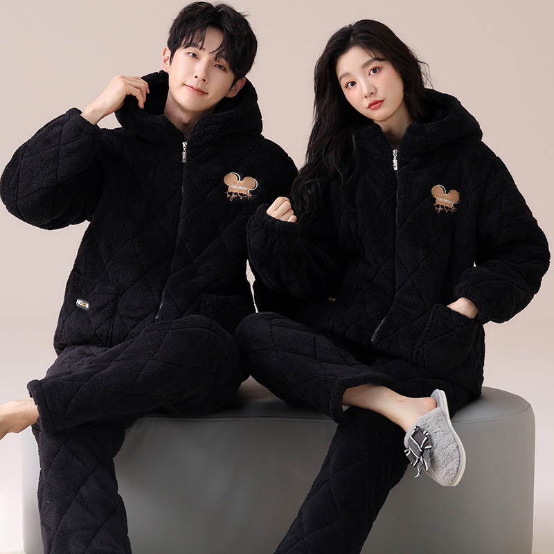 情侣睡衣三层夹棉加厚加绒甜美连帽拉链保暖男女休闲家居服套装