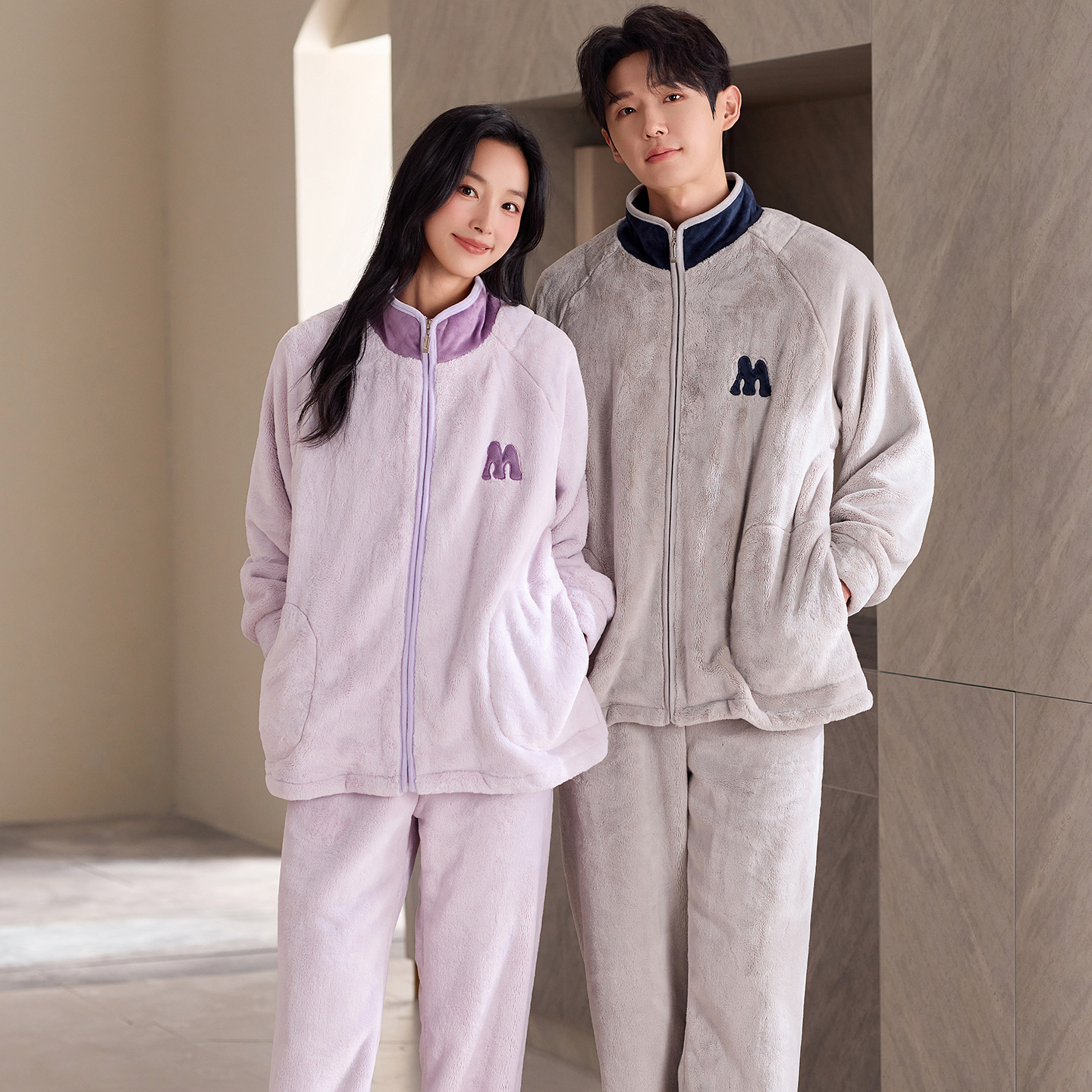 情侣珊瑚绒睡衣冬季立领运动风拉链家居服一男一女可外穿套装加绒