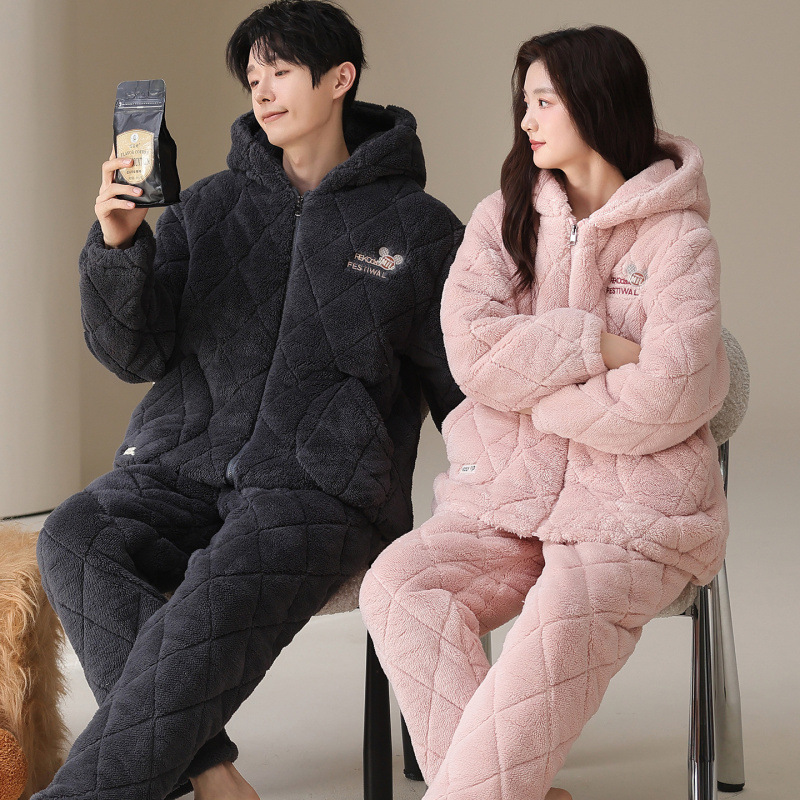 冬のカップルのパジャマの女性の3層の綿の厚いベルベットの冬の新型の保温性の男女のジッパーの部屋の服のスーツ