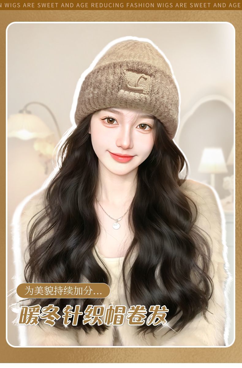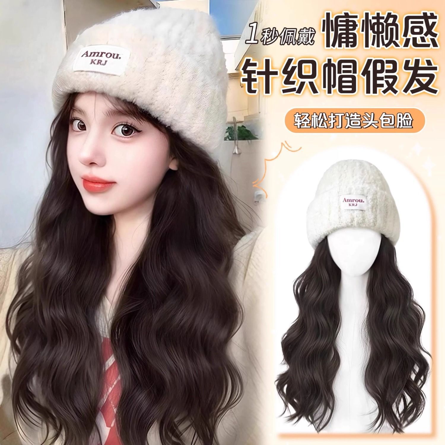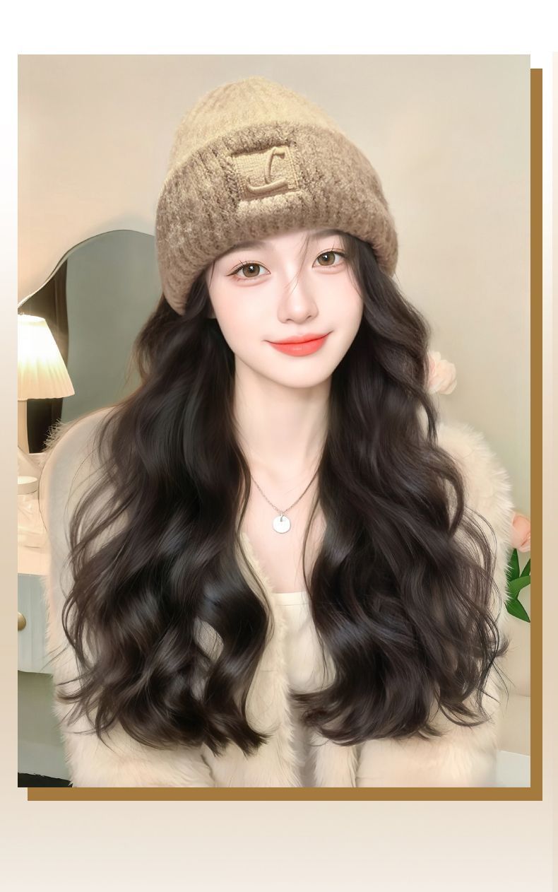 帽子かつら一体女性ファッション秋冬保温毛糸帽自然ふわふわシミュレーション髪全体のかつら