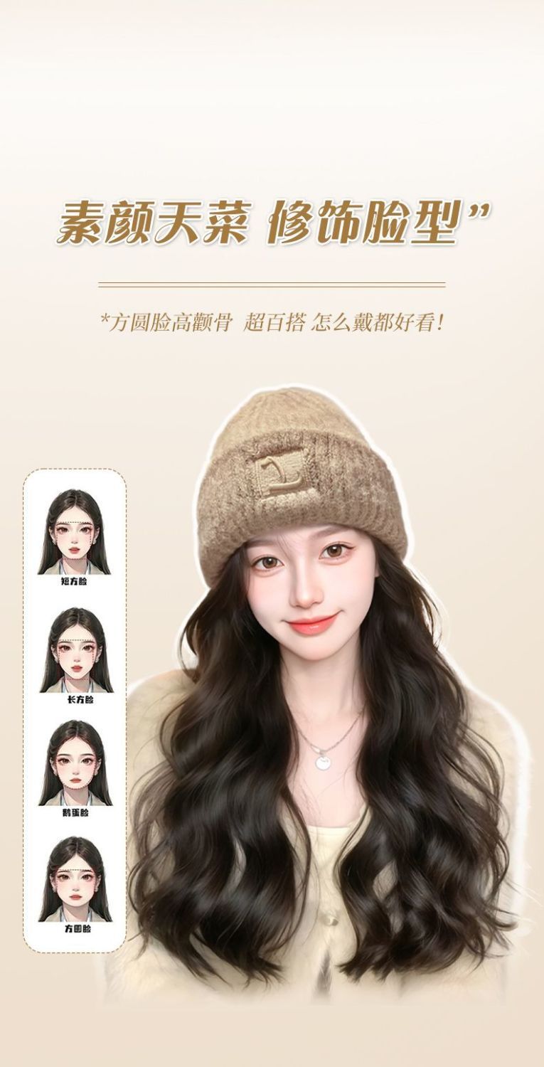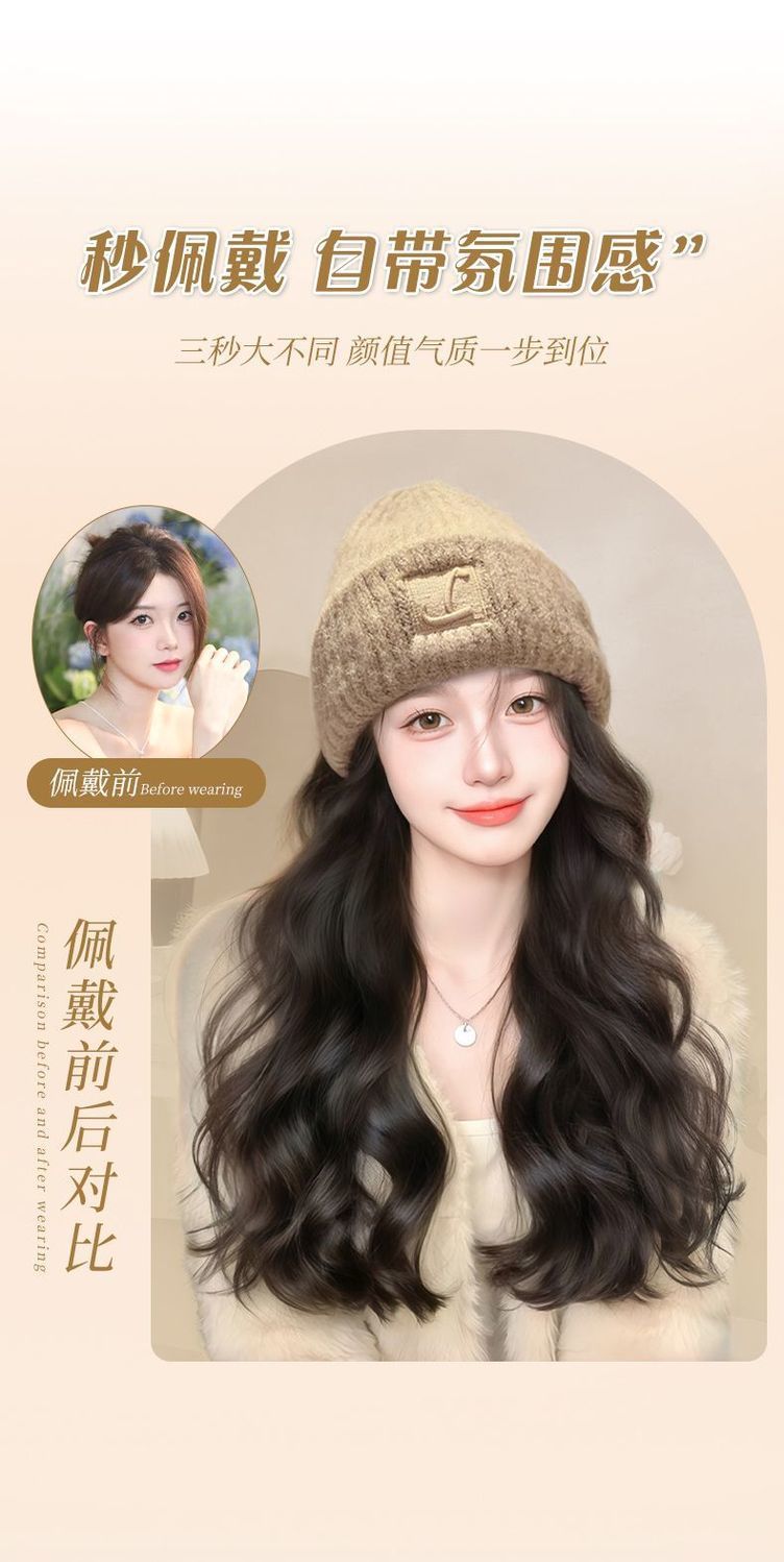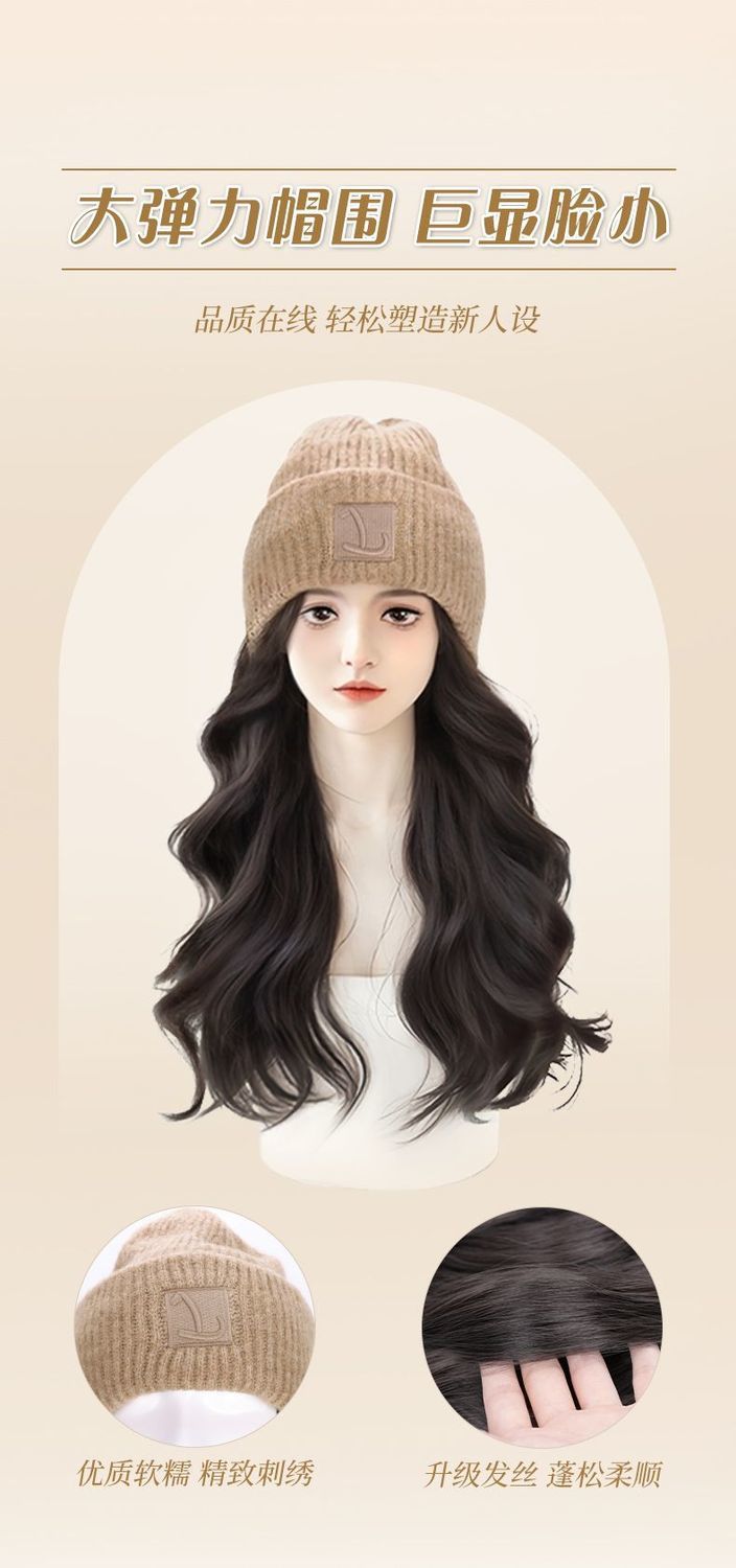 帽子かつら一体女性ファッション秋冬保温毛糸帽自然ふわふわシミュレーション髪全体のかつら