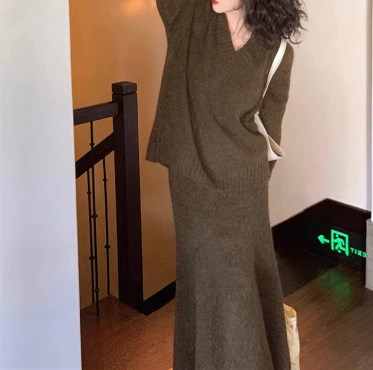 フランス式の怠惰なvネックのプルオーバーのセーターのニットの女性の2024秋冬の上着の魚の尾の半身のスカートの2つのセット