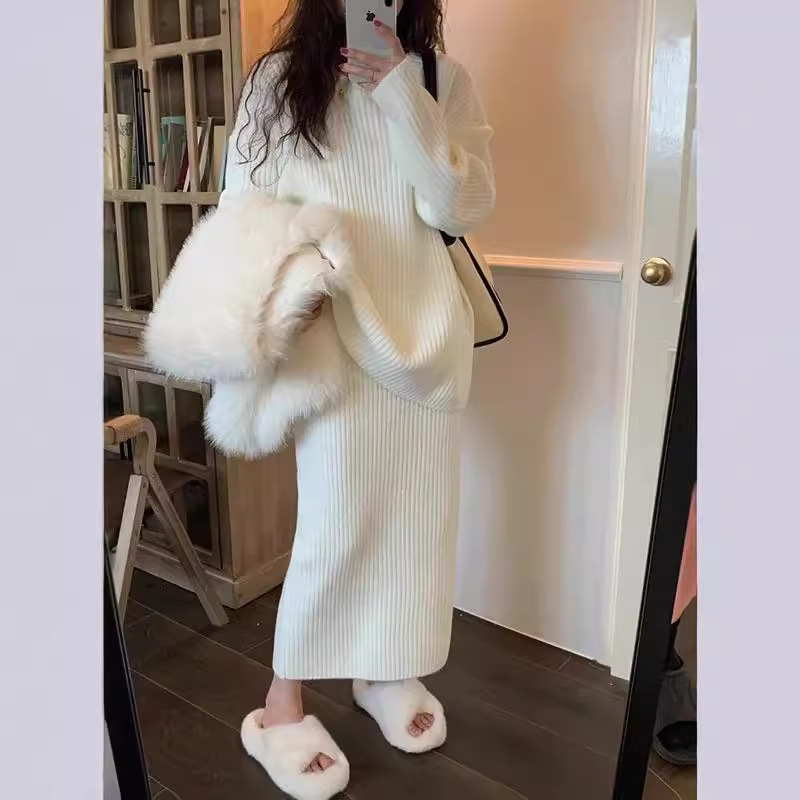 ニットフィッシュテールスカートセーターセット女性の秋と冬の新しい怠惰なスタイルルーズ多用途セーターツーピースセーター