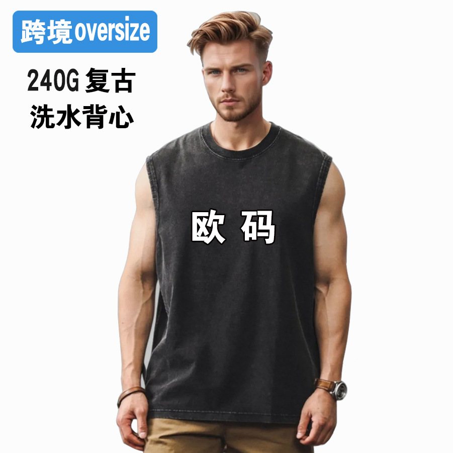欧美跨境男洗水做旧背心无袖圆领背心宽松运动oversize无袖