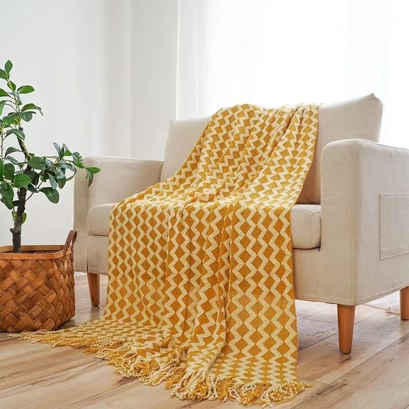 新款北欧INS针织毛线毯沙发装饰毯床尾巾黄色搭巾样板房包邮长款